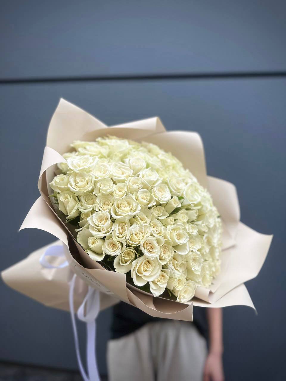 Сто один бутон сорта Athena собраны в монохромную композицию безупречной формы. Белый цвет раскрывается во всей своей чистоте, создавая впечатление спокойной уверенности.