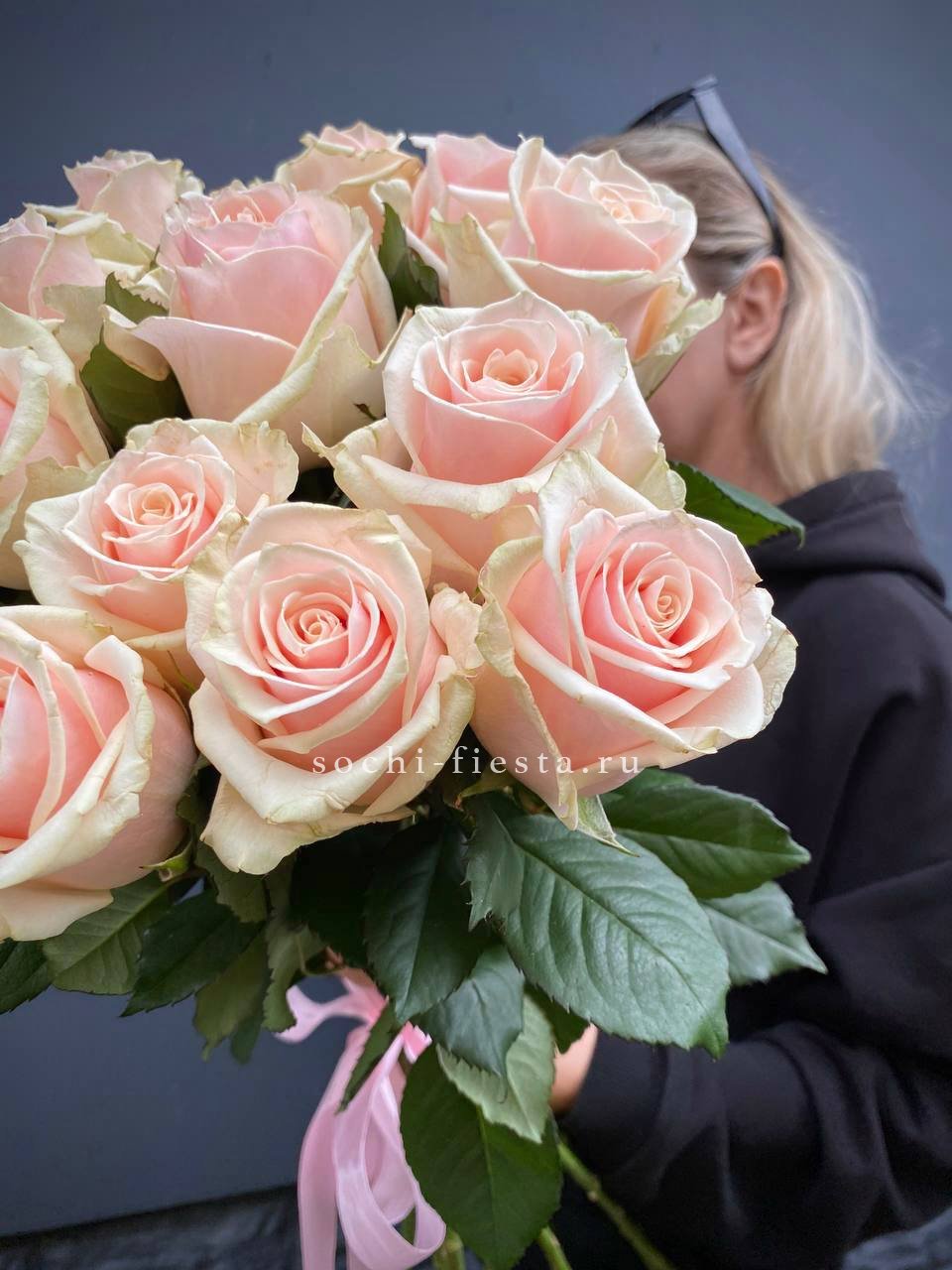 Французские розы распускаются мягкими облаками пудрового оттенка. Лимониум добавляет воздушности, а эвкалипт создает свежую основу. Букет собран так, что каждый бутон виден и дышит.