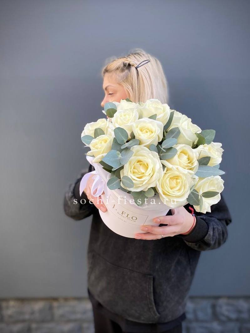 белые розы с эвкалиптом в боксе 16.