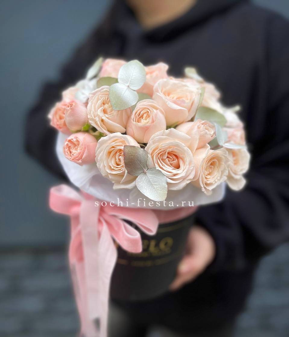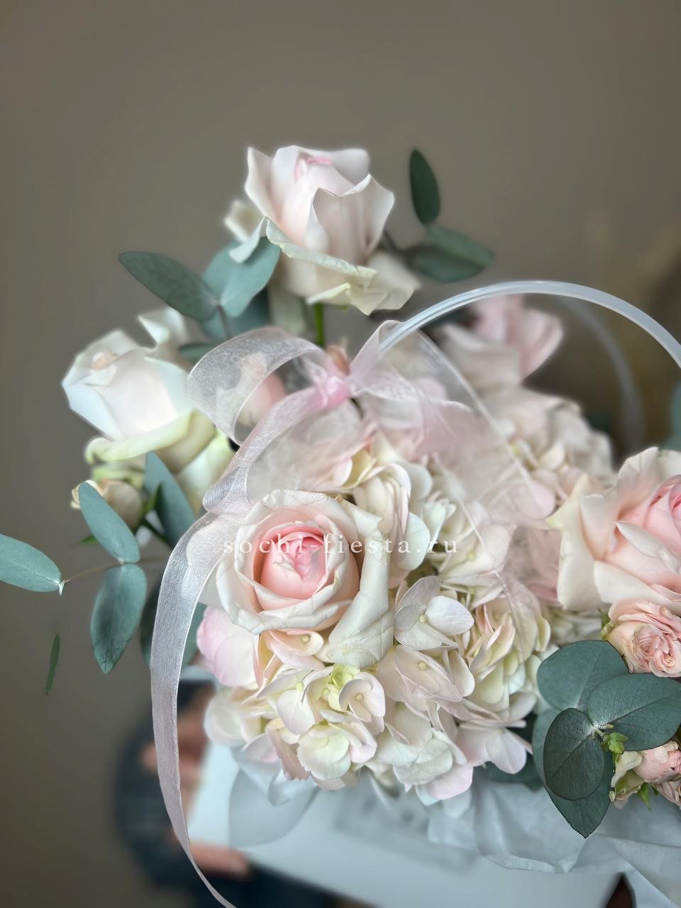 гортензия, розовые розы, пионовидные розы, диантус, эвкалипт, лента, сумка-кашпо.