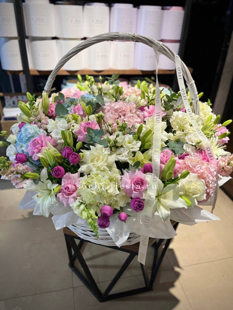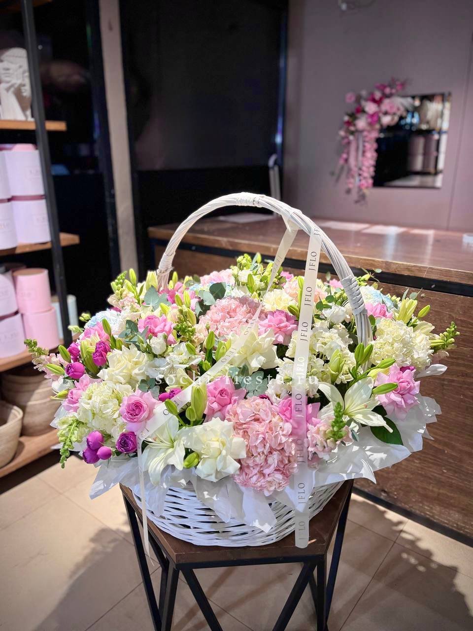 Гортензия и пионовидные розы создают густую округлую форму с мягкими переходами оттенков. Диантус добавляет воздушные вкрапления между крупными бутонами. Композиция в сумке-кашпо держит силуэт и выглядит цельно.