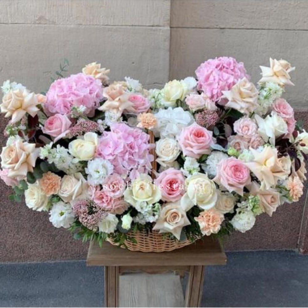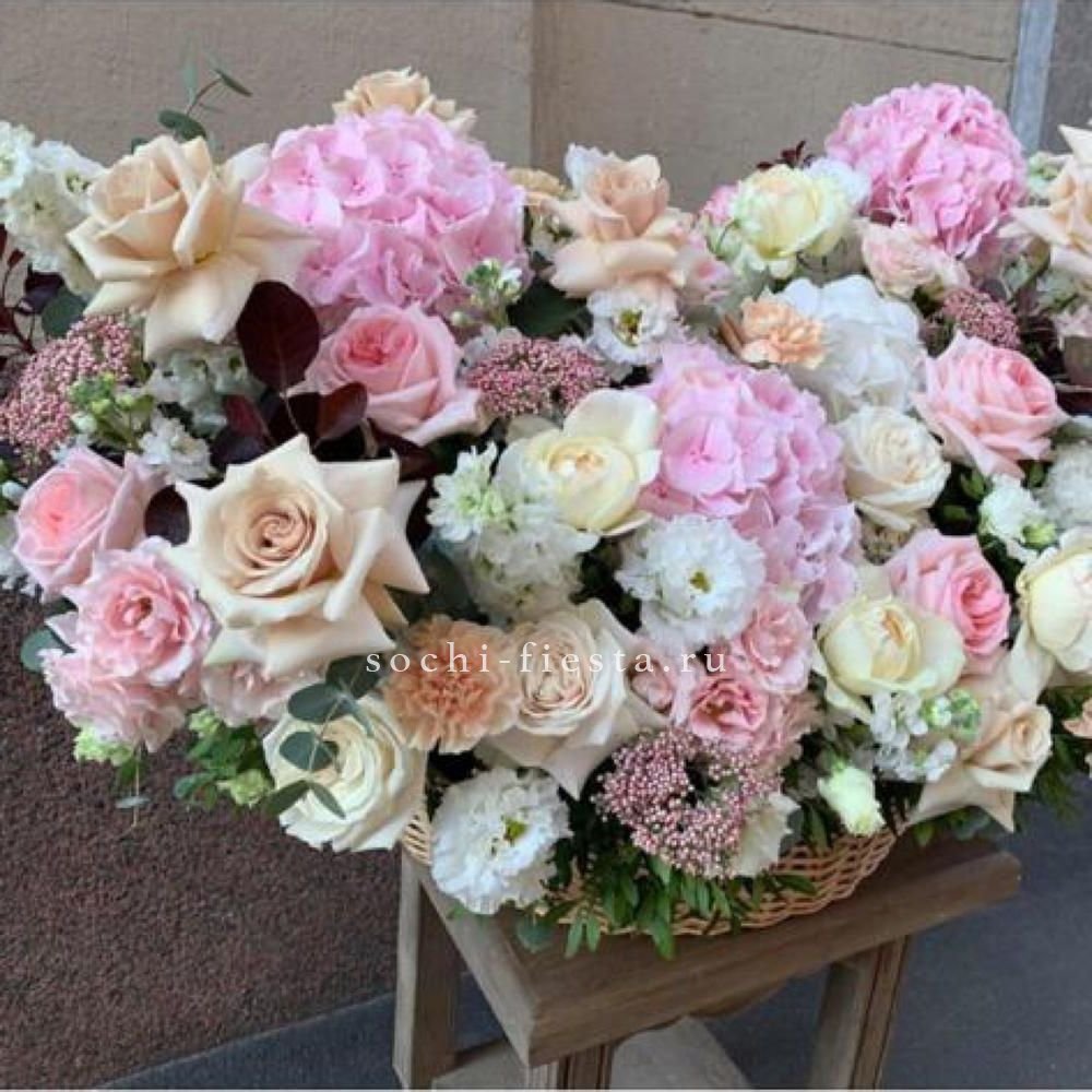 гортензия - 11 шт., пионовидная кустовая роза Мисти Баблс 7 шт., лента, дизайнерская упаковка.