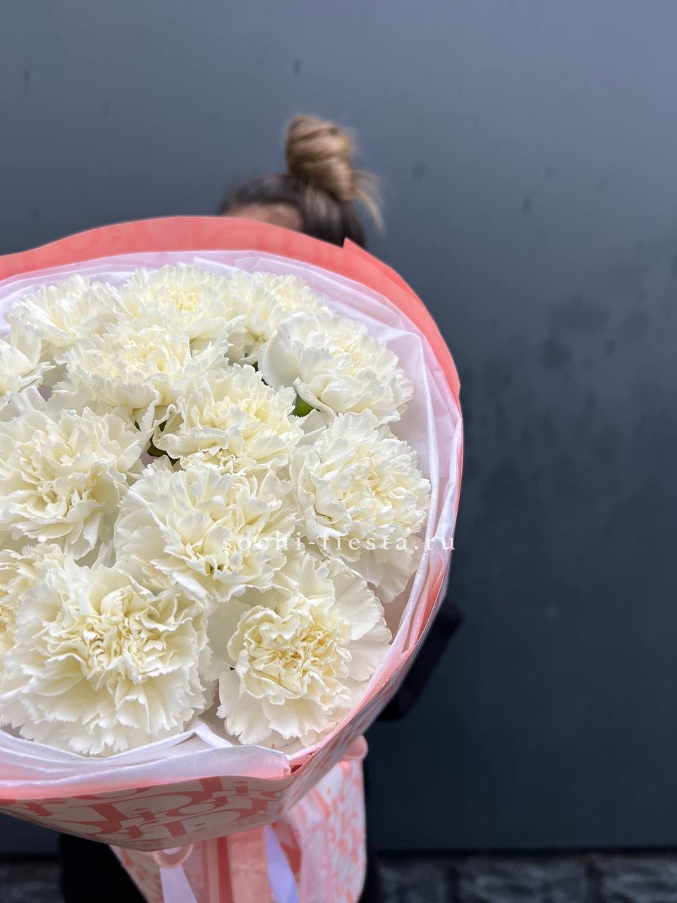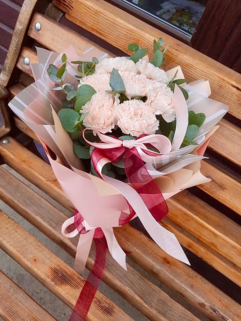 Букет из пятнадцати белых диантусов вписывается в любое пространство благодаря компактной форме. Цветы долго сохраняют свежесть и не требуют сложного ухода.