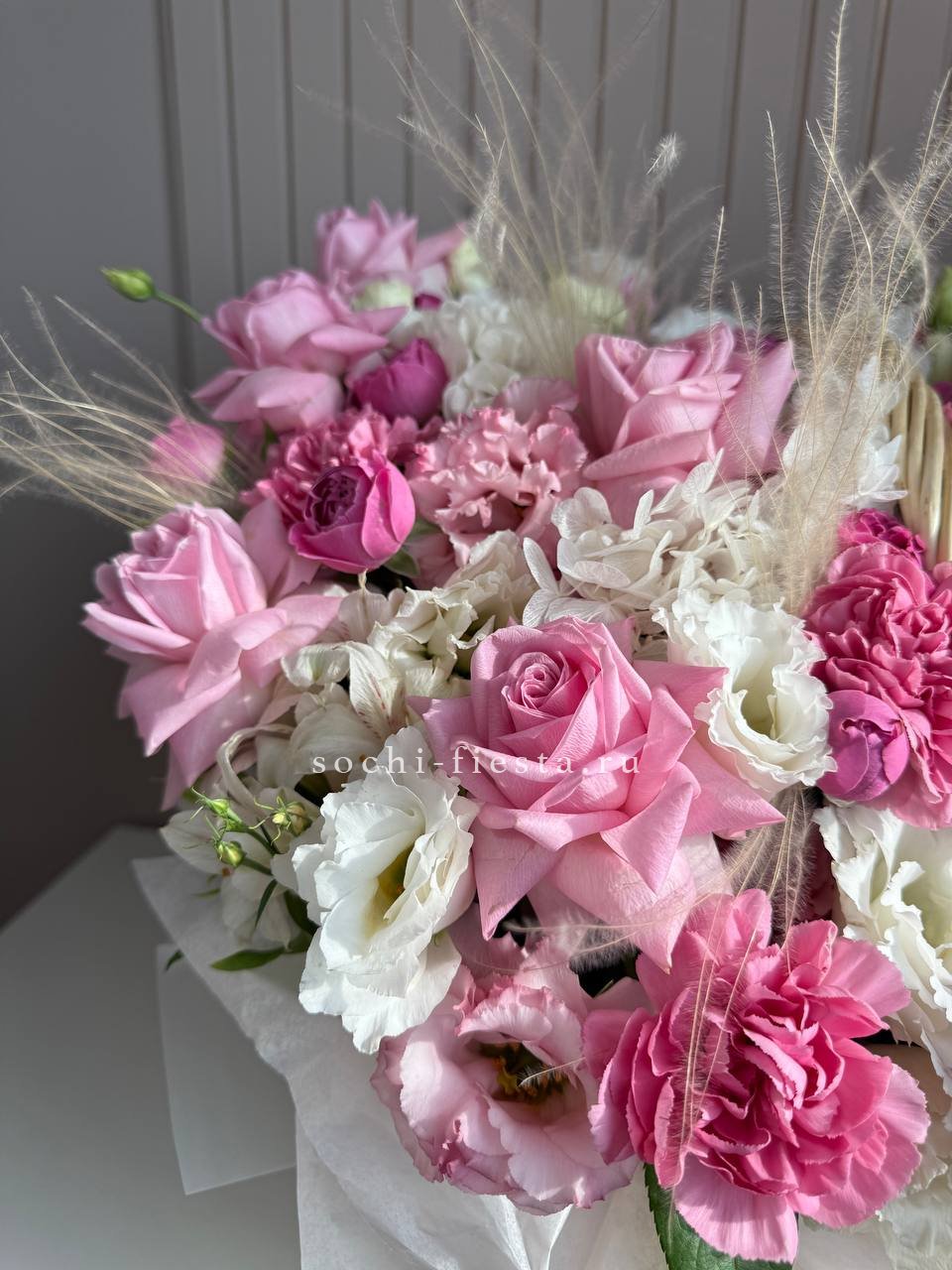 Пышная гортензия задает объем, а французские розы и эустома создают многослойную глубину. Диантусы добавляют графичные точки, эвкалипт обрамляет композицию мягкими линиями.