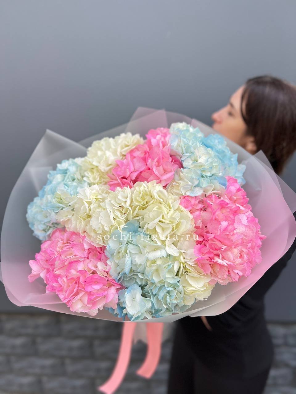 гортензия, лента, дизайнерская упаковка. Цвет гортензии на выбор