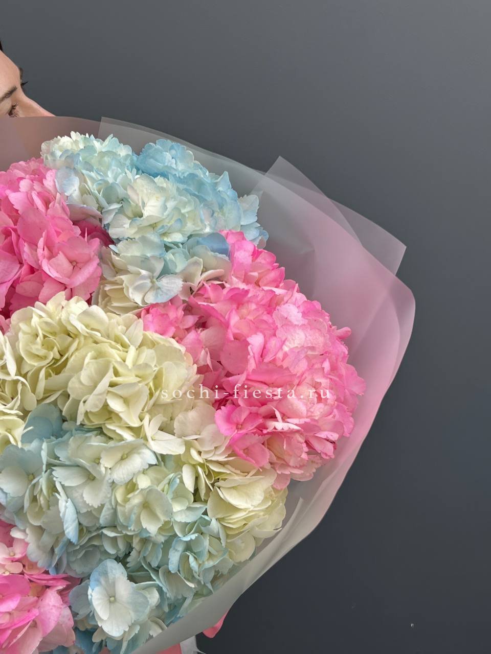 Пышная шапка гортензии в мягкой тонированной упаковке напоминает облако в обрамлении ткани. Соцветие раскрывается множеством мелких лепестков, создавая объёмную текстуру и живую игру оттенков.