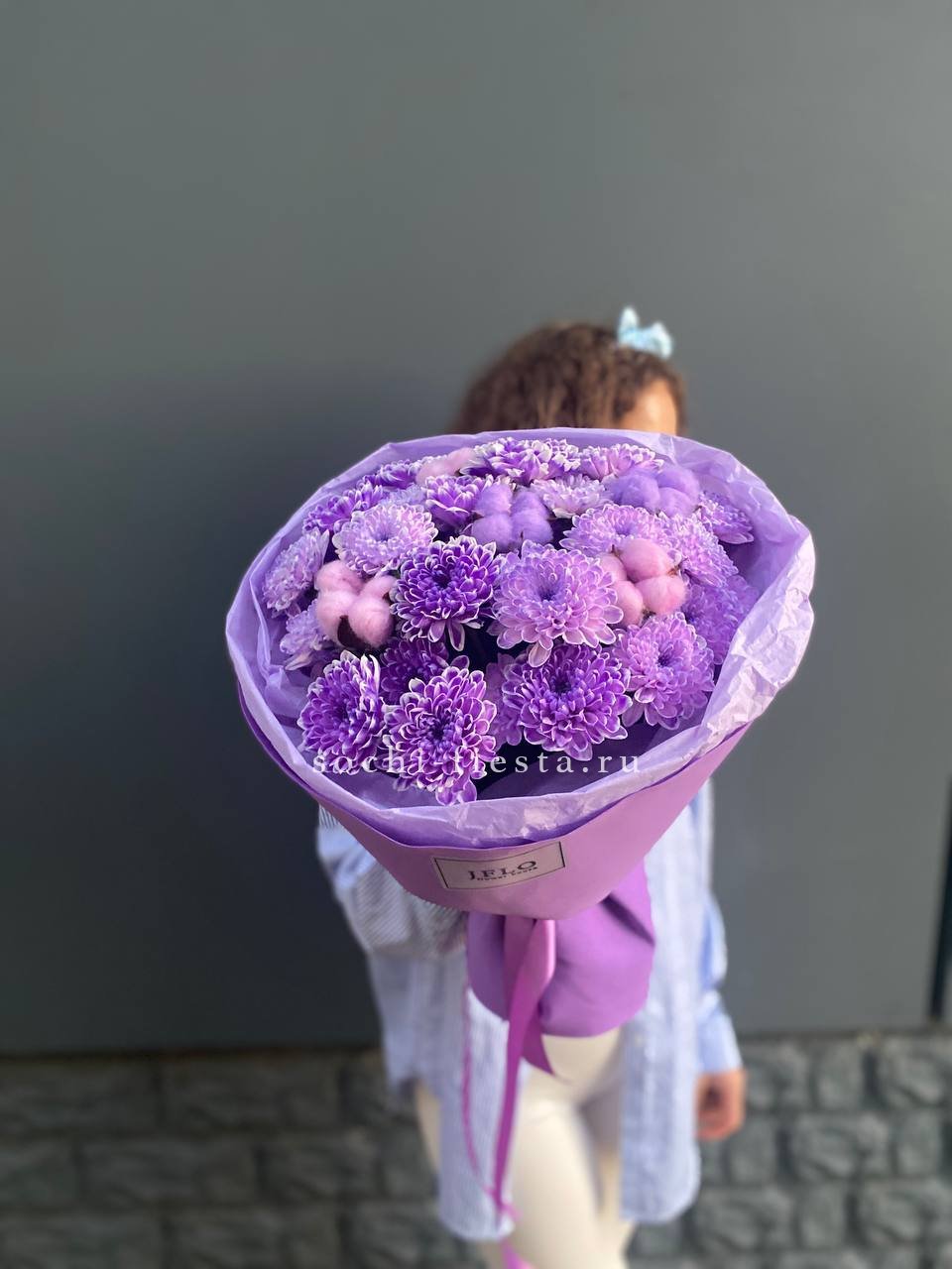 Букет объединяет пушистые соцветия кустовой хризантемы и матовые коробочки хлопка. Природные текстуры дополняют друг друга и создают спокойную гармонию.