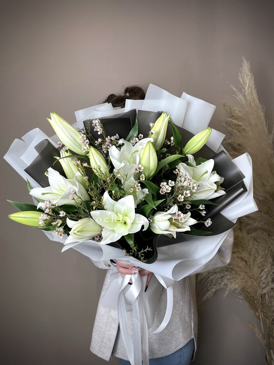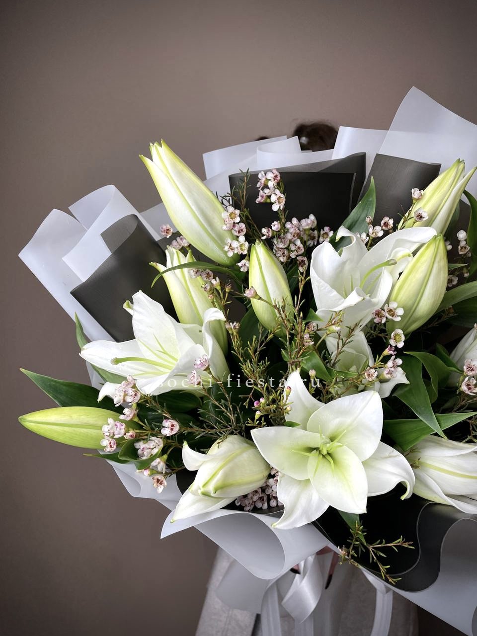 Семь белых лилий собраны в классический букет с лаконичной упаковкой. Крупные бутоны раскрываются постепенно, наполняя пространство своим присутствием.