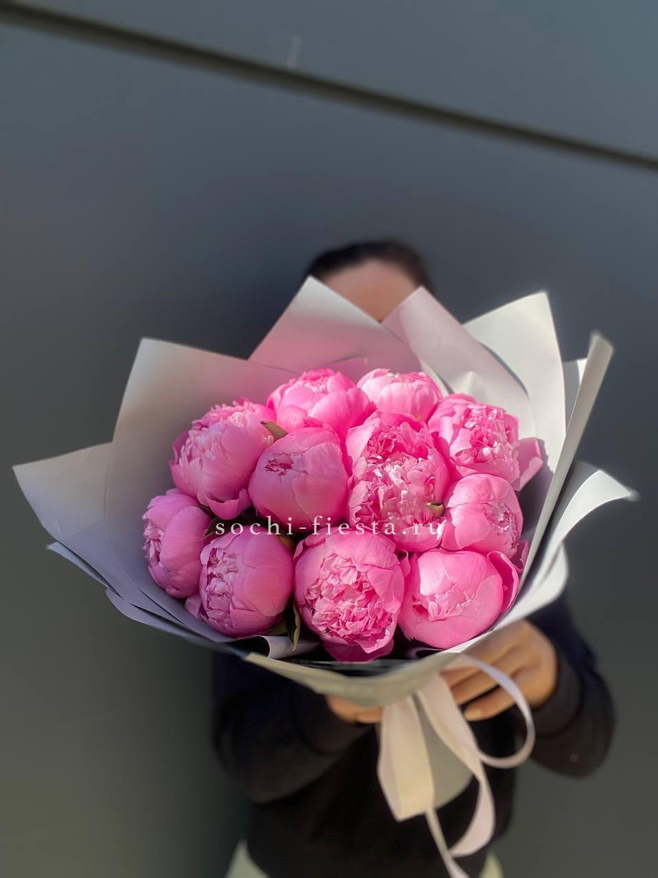 розовые пионы, лента, упаковка.