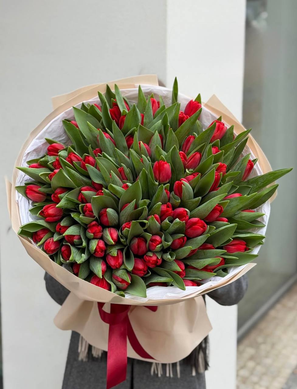 Сто один белоснежный тюльпан собран в плотную охапку с безупречной геометрией. Классическая упаковка сохраняет естественную красоту бутонов и подчёркивает масштаб композиции.
