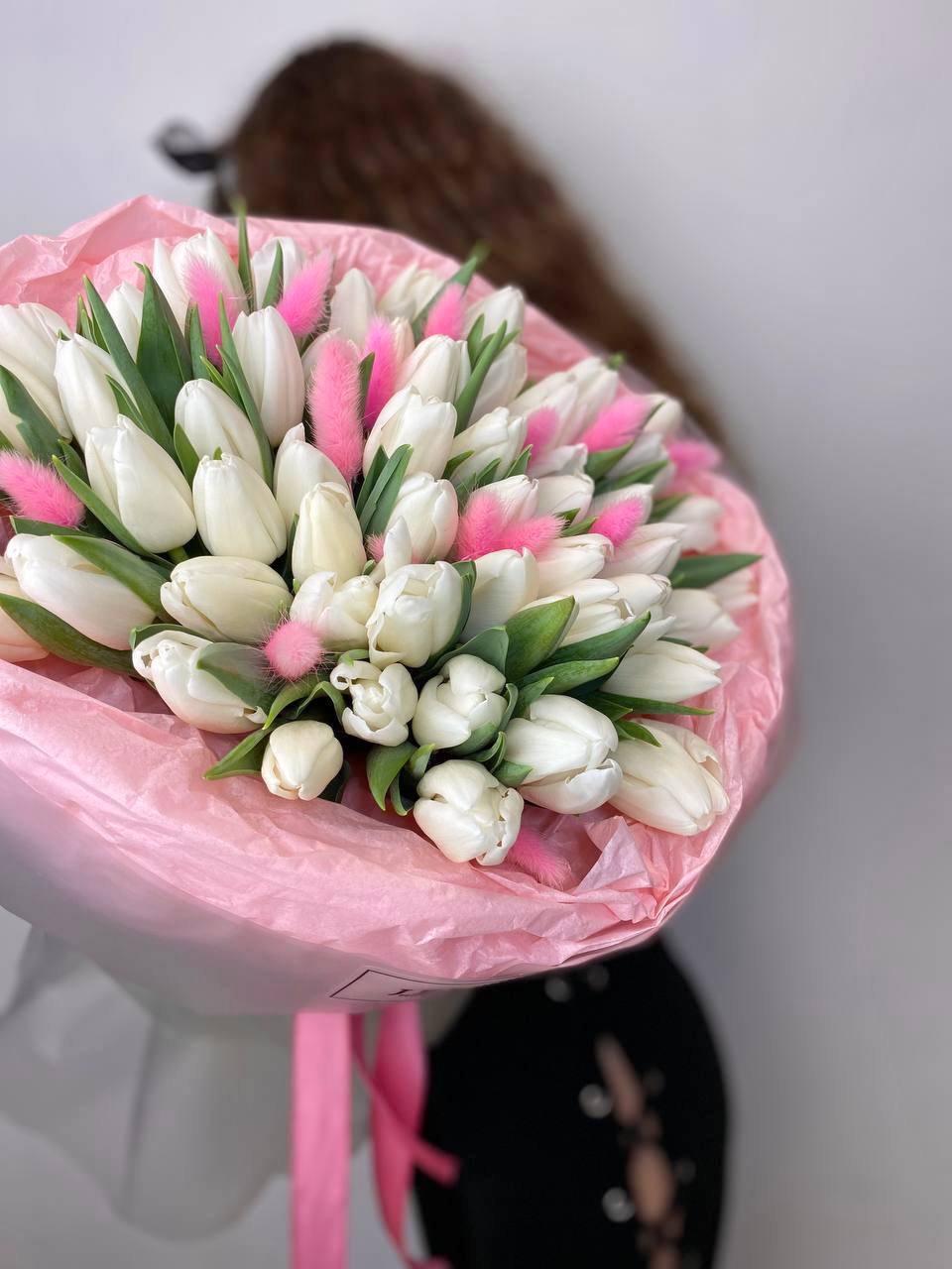 Сто один тюльпан в светлой гамме создаёт впечатляющий объём и выразительное присутствие. Плотная сборка бутонов образует графичную форму с чётким силуэтом.