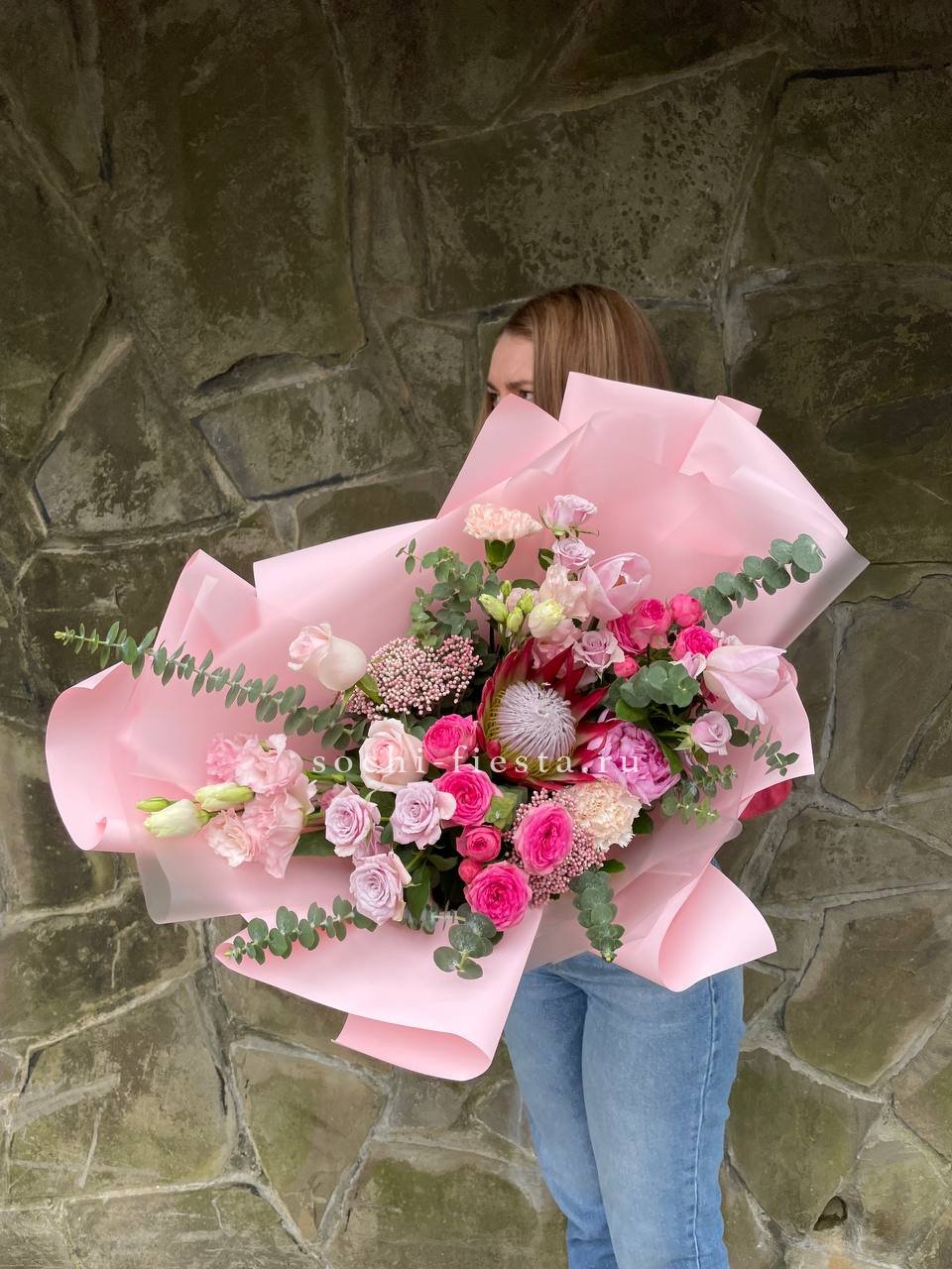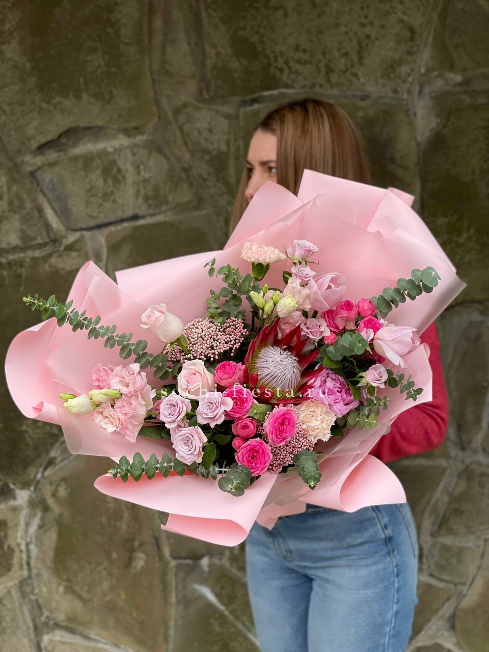 протея, роза кустовая, эустома, диантус, роза одноголовая, эвкалипт, озотамнус (по сезону) лента, дизайнерская упаковка.