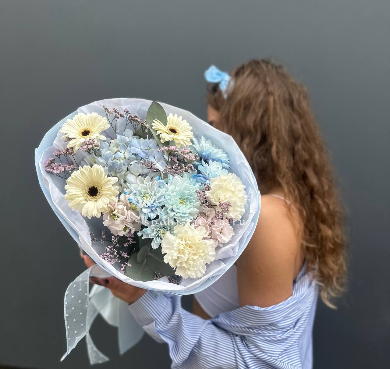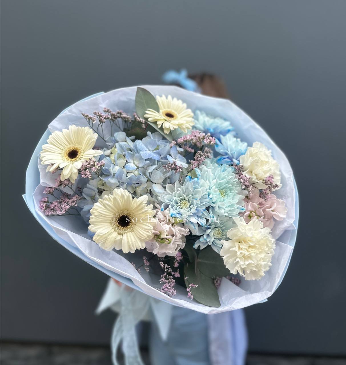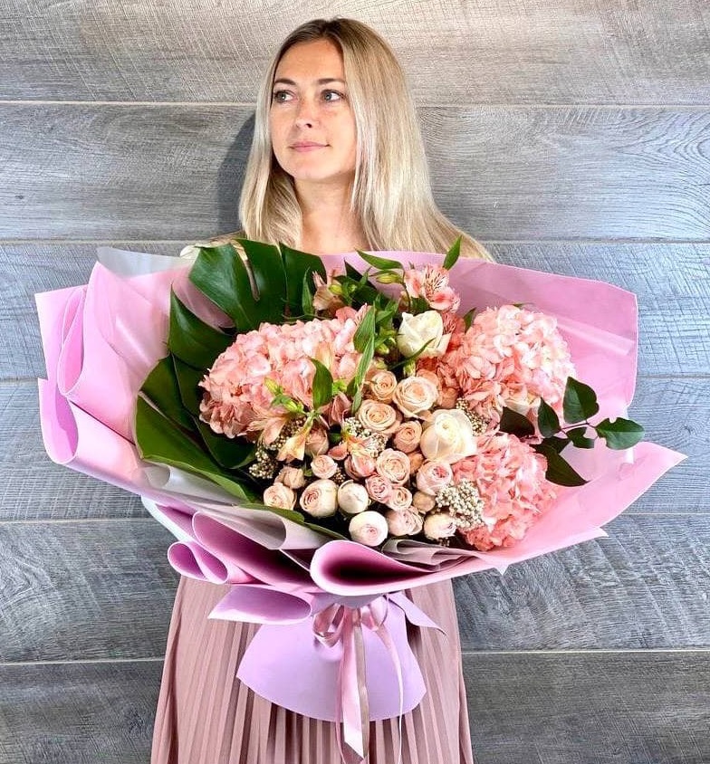 гортензии, роза одноголовая, роза кустовая, гербера, озотамнус, диантус, эвкалипт, декоративные перья, лента, дизайнерская упаковка.