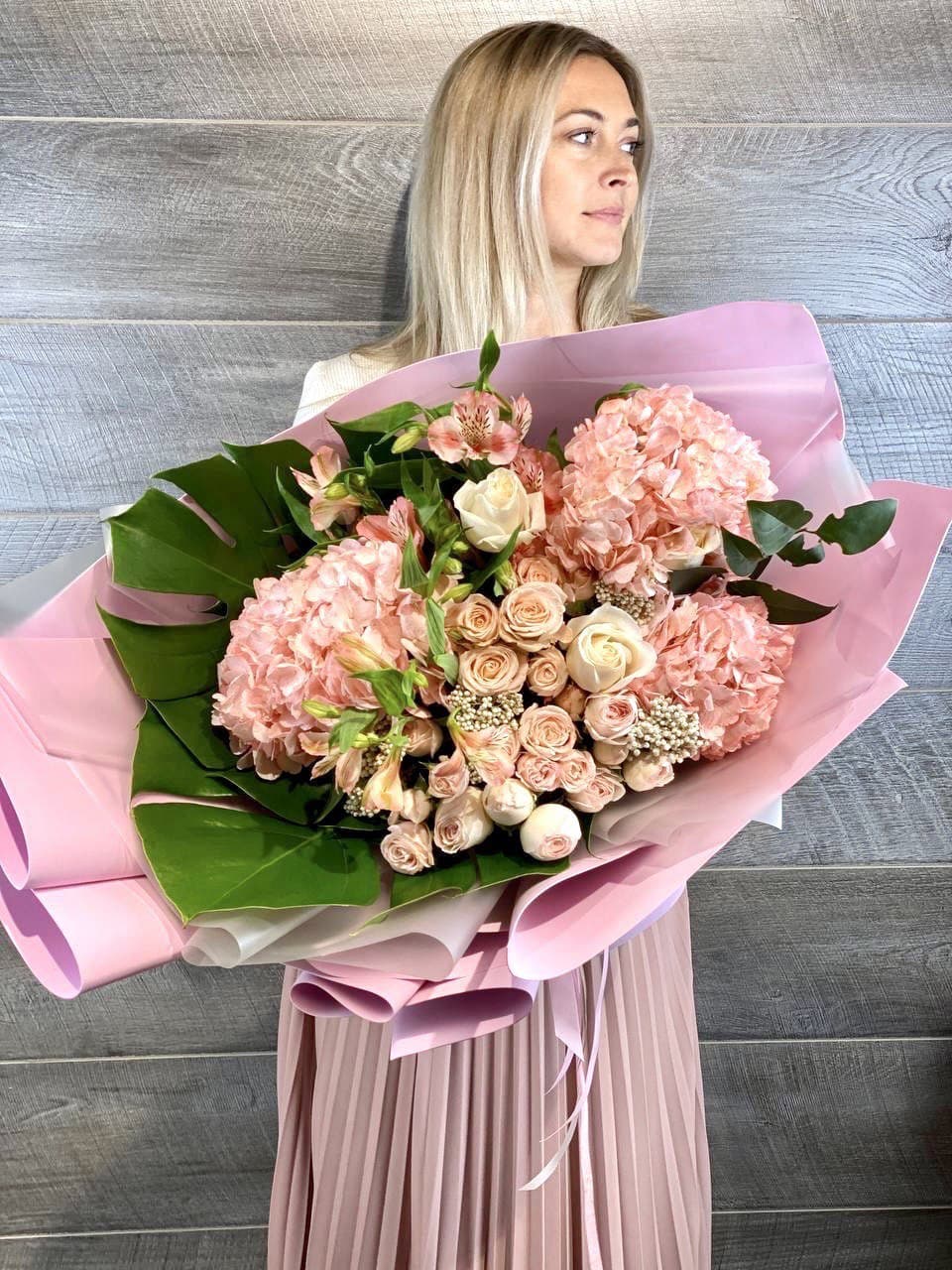 Пышный микс соцветий гортензии, роз и гербер с добавлением перьев и озотамнуса. Авторская композиция объединяет садовую свободу и графичную точность линий.