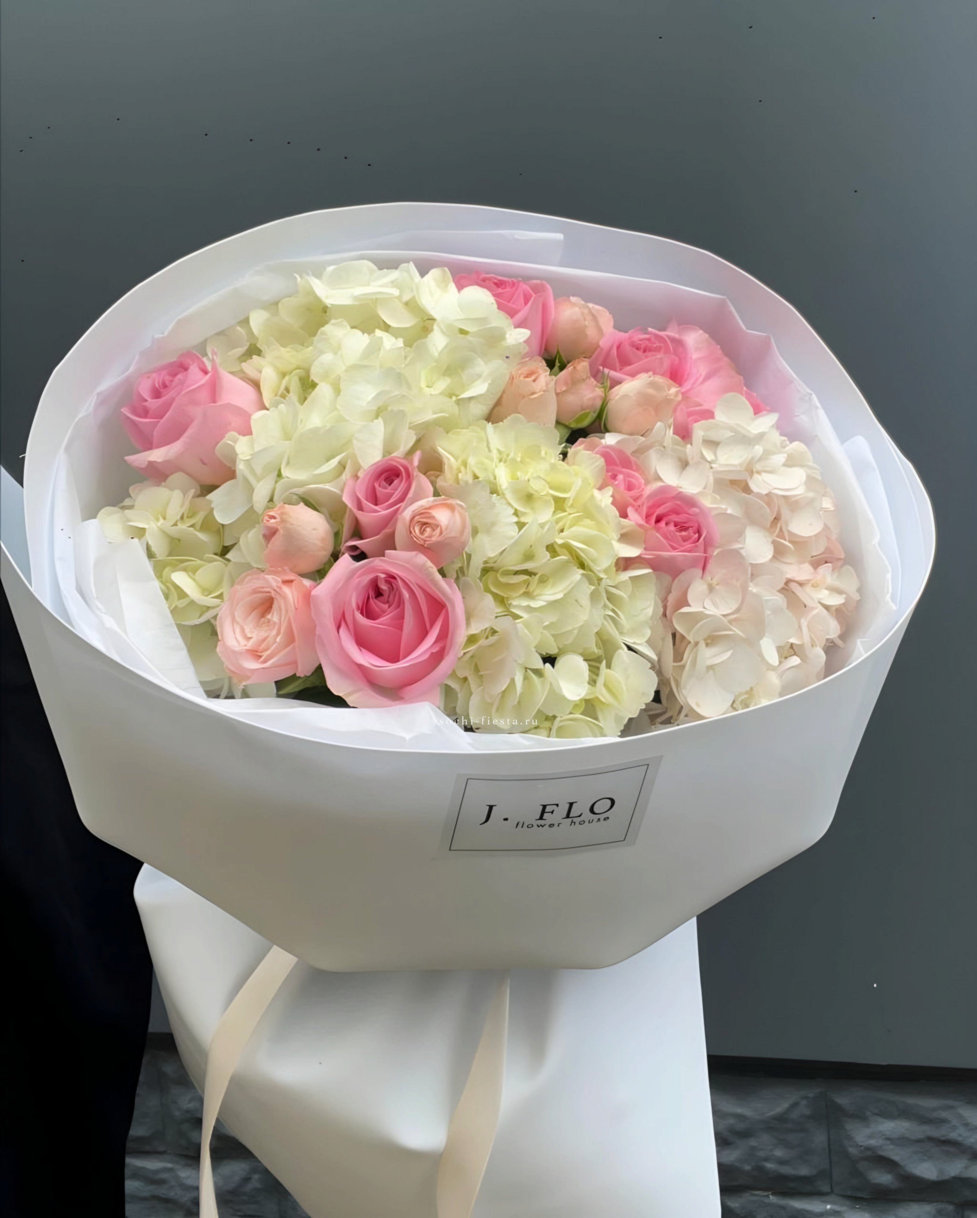Плотная сборка из роз и хризантем с волнами маттиолы создает густую текстуру. Эвкалипт добавляет графику, а авторская упаковка завершает форму. Букет держит объем и выглядит цельно.