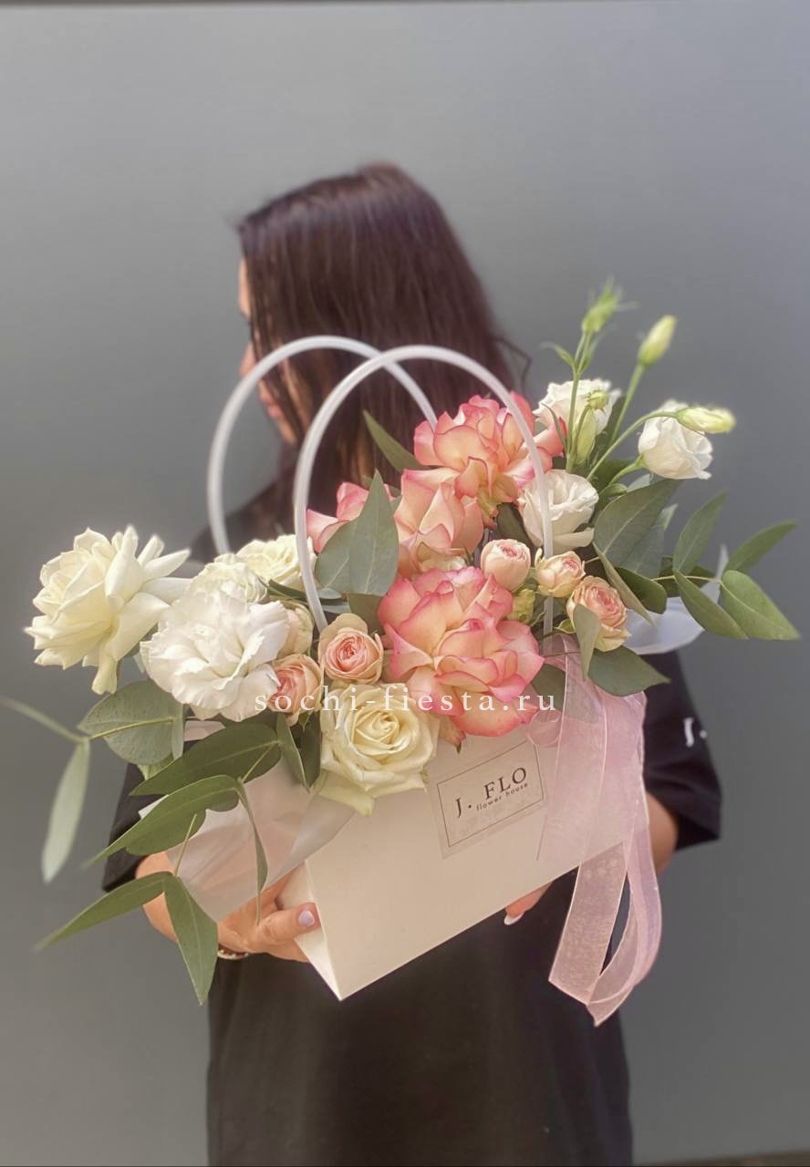 одноголовые розы, кустовые розы, гортензия, лимониум, лента, цилиндр D16.