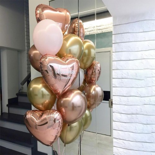 композиция состоит из 2-х фонтанов шаров. Общий состав: 2 шт. фольгированных шара звезда золотого цвета, 2 шт. фольгированных шара сердце цвета розовое золото, 8 шт. хромированных шаров красного/розового цвета, 4 шт. латексных шаров белого цвета, 4 шт. хромированных шаров цвета розовое золото, 6 шт. шаров с наполнением конфетти серебряного цвета, грузики Все шары мы предварительно обрабатываем специальным составом Highfloat, обеспечивая им длительный срок полета.