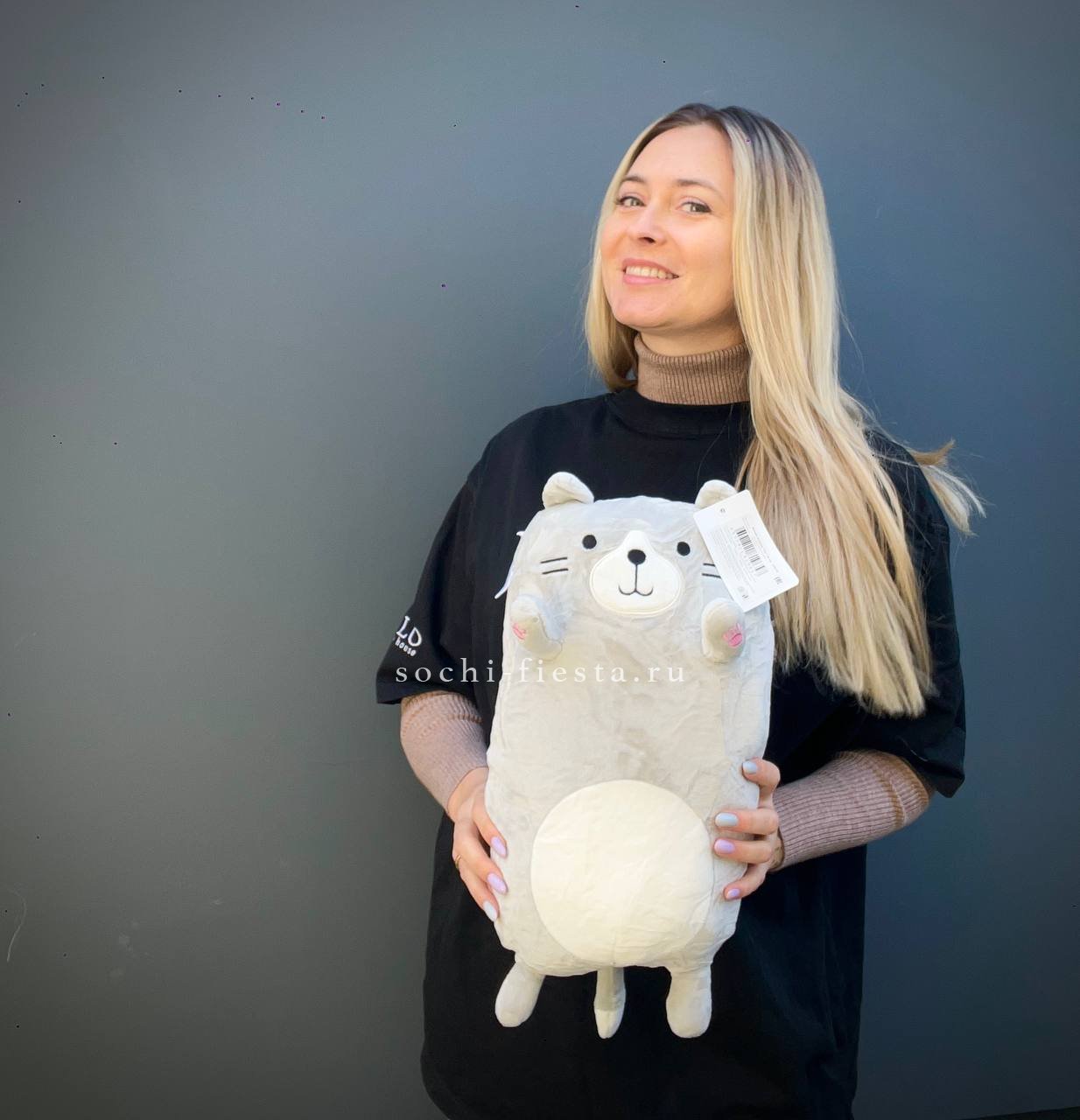 Кот пирожок лежит плоско и уютно помещается в руках или на коленях. Его округлая форма и мягкость располагают к тактильному контакту.