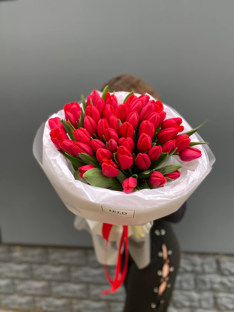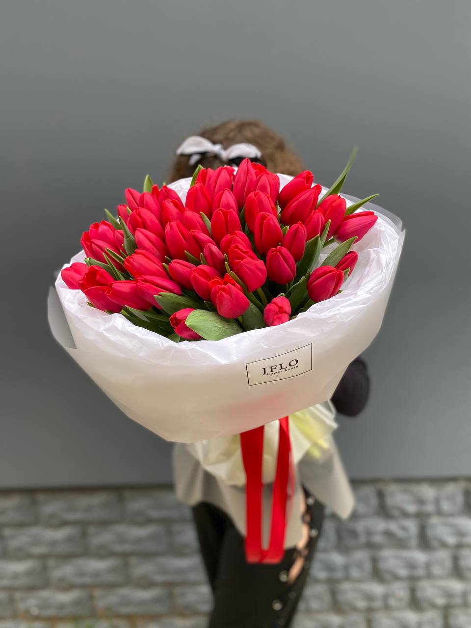 Красные тюльпаны переплетаются с розами в динамичной композиции, где весенняя лёгкость встречается с классической формой. Два цветка в одном букете создают визуальную глубину и живой ритм.
