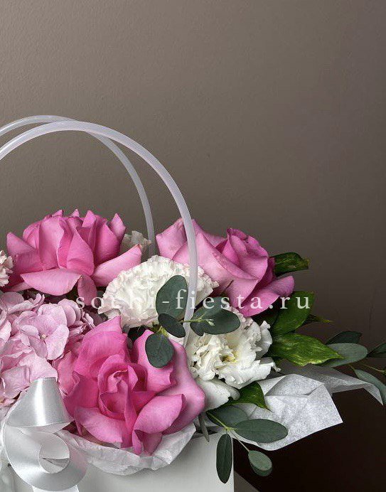 герберы, эустома, белая роза, эвкалипт, лента, сумка-кашпо.