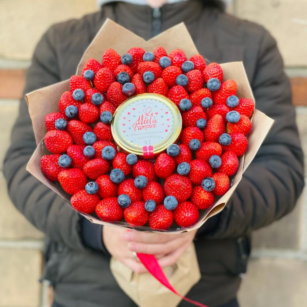 1100-1200 г. ароматной клубники, 100г. голубики, баночка мёда, лента, крафт.