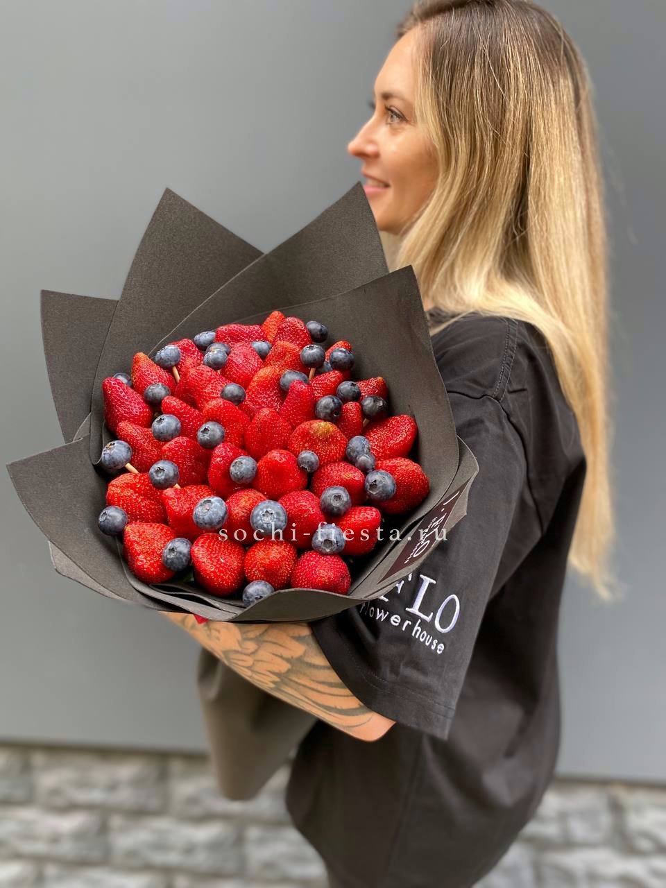 1000 г. ароматной клубники, 200 г. голубики, лента, оформление.