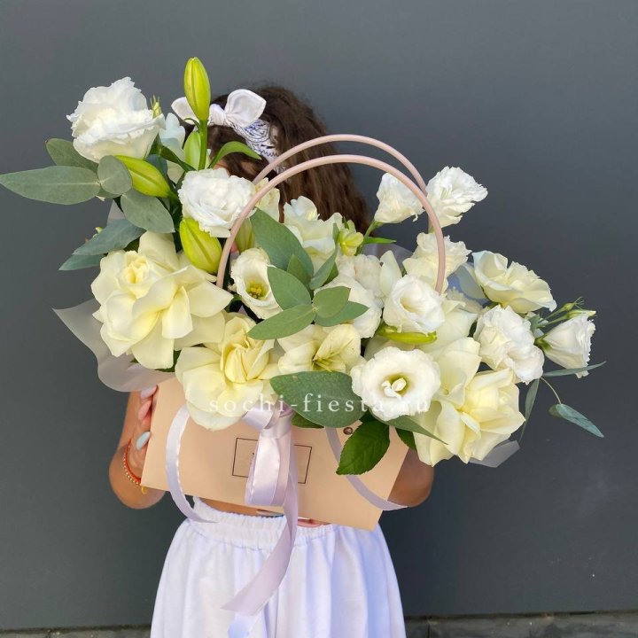 Коробка в студии Брянске — плотный картон с матовой поверхностью, иногда с тиснением логотипа. Внутри — флористическая губка (оазис), предварительно пропитанная водой. Сверху — атласная или шёлковая лента, декоративная тесьма, иногда фирменная открытка.