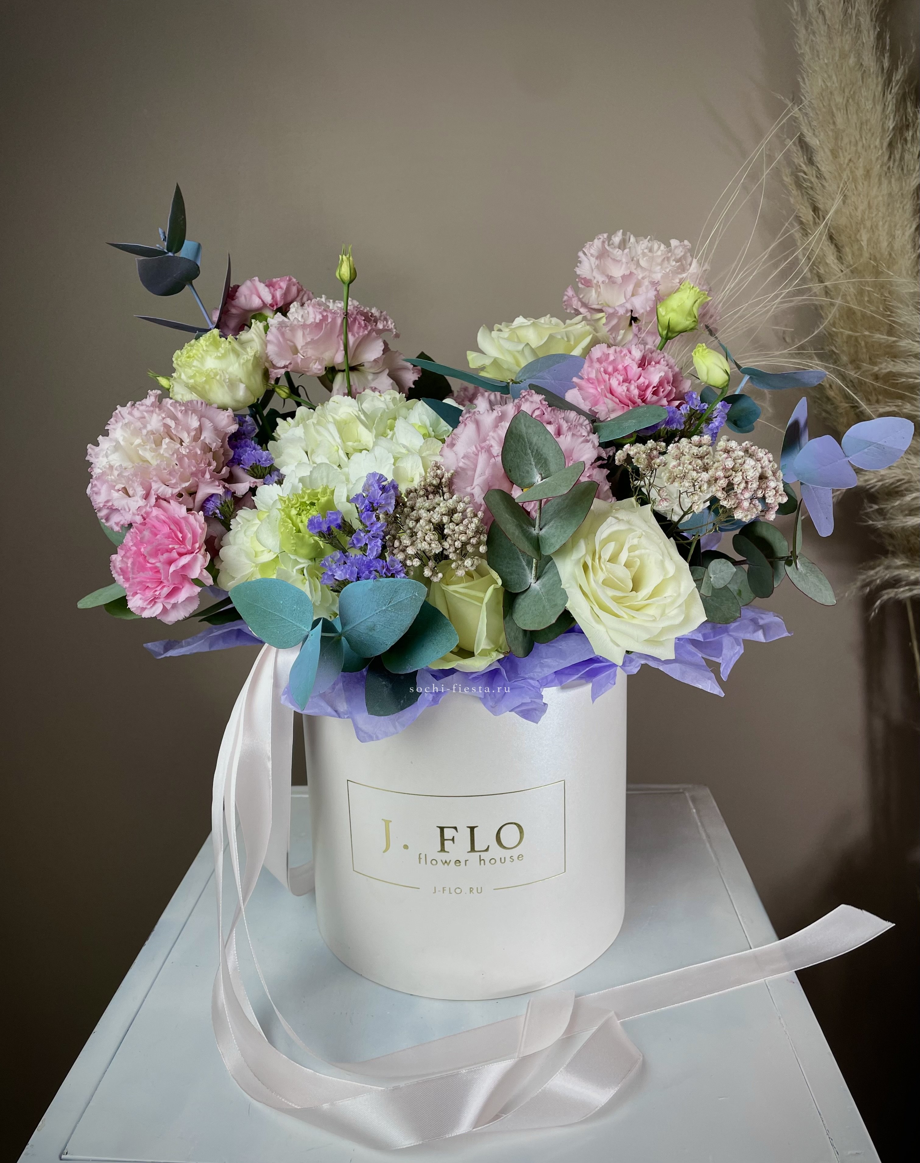 Белые розы и гортензия формируют объёмную основу, лилии вытягивают композицию вверх. Диантус и статица заполняют промежутки, создавая плотную текстуру в цилиндре.