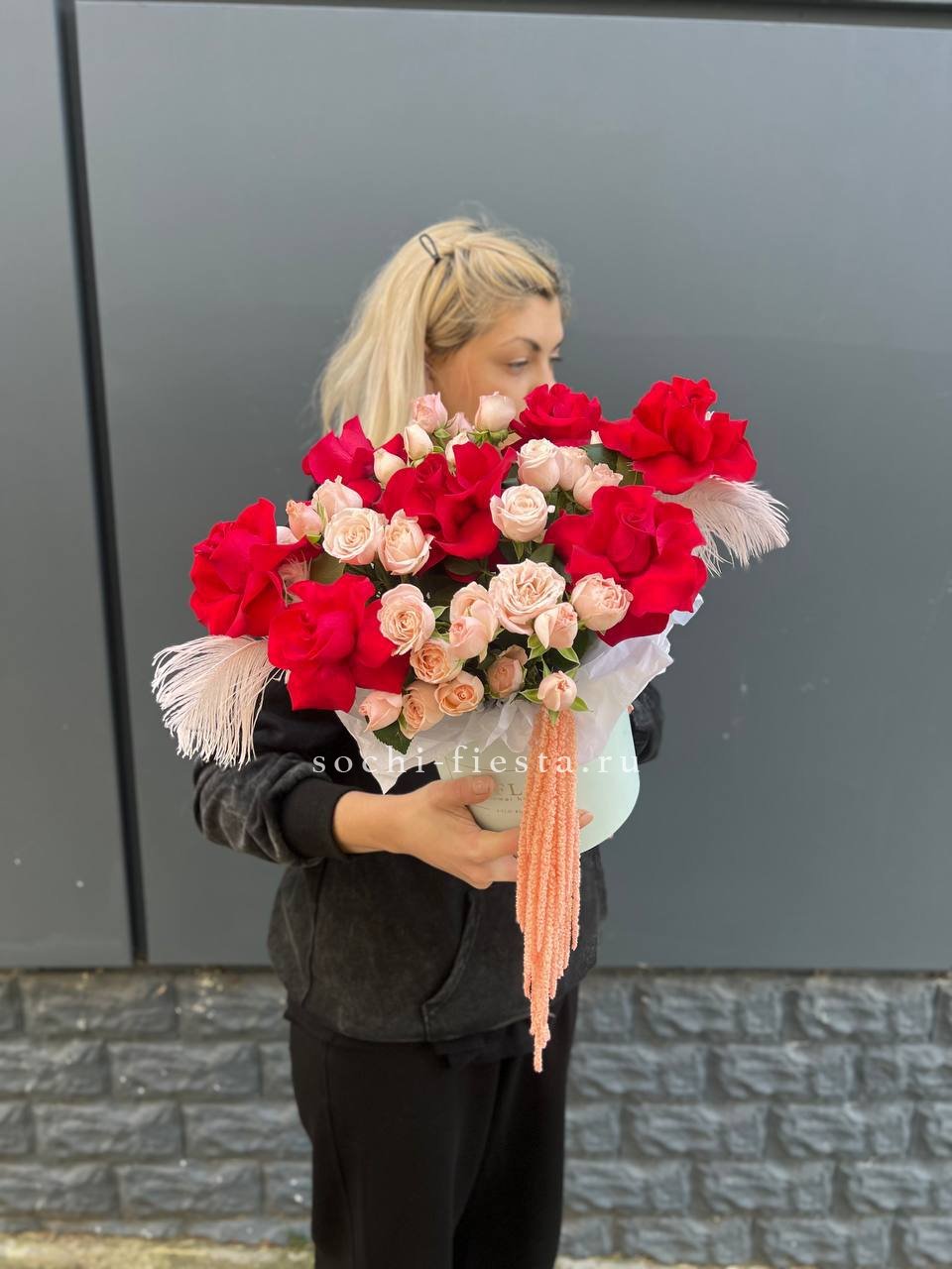Красные и розовые розы создают яркую игру оттенков в просторном боксе. Диантус и озотамнус добавляют воздушности, мисти баблс расставляет акценты.