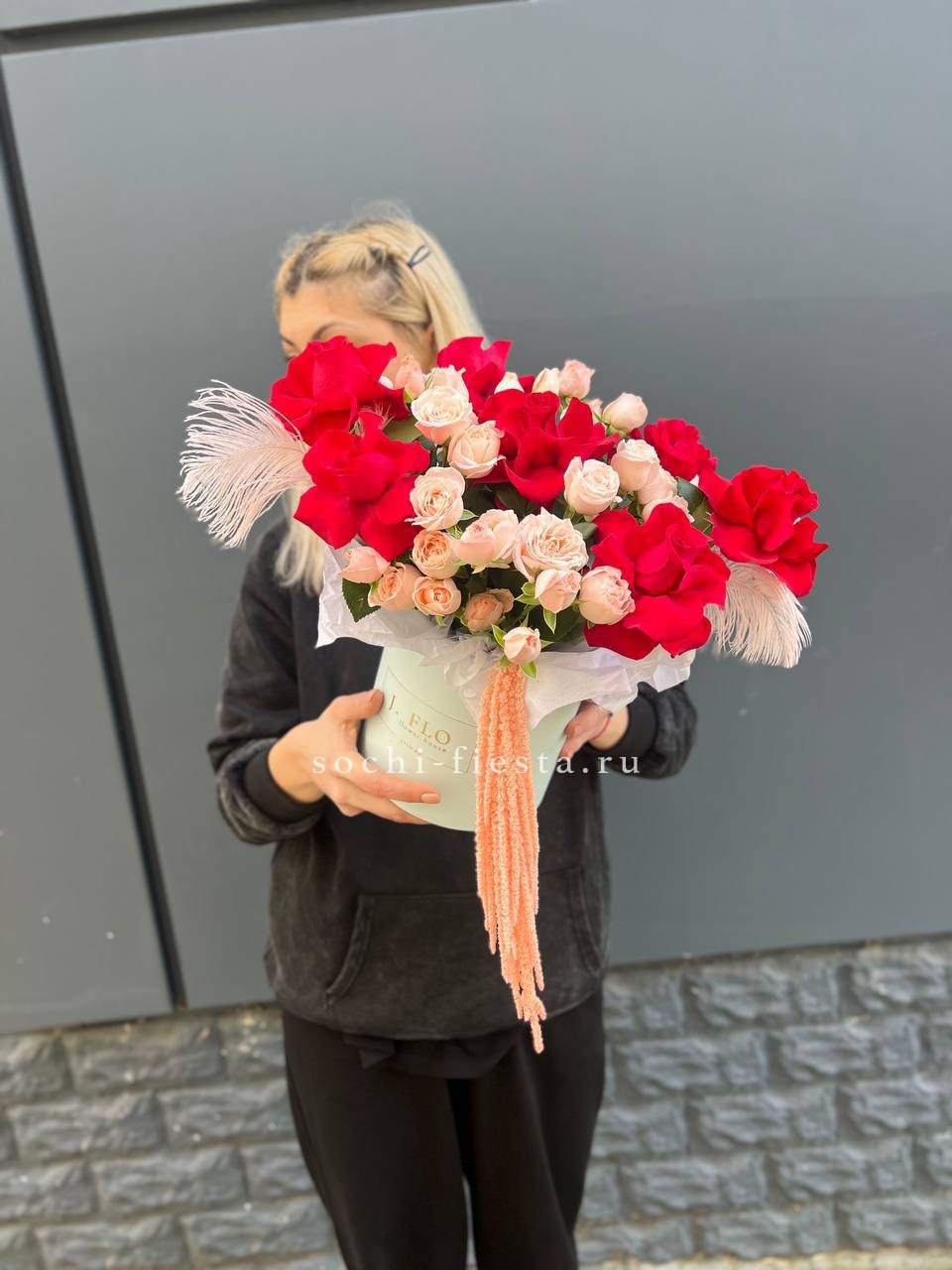 Красные французские розы с плотными бутонами дополнены воздушным бомбастиком и лёгкими перьями. Композиция выглядит собранно и сдержанно.