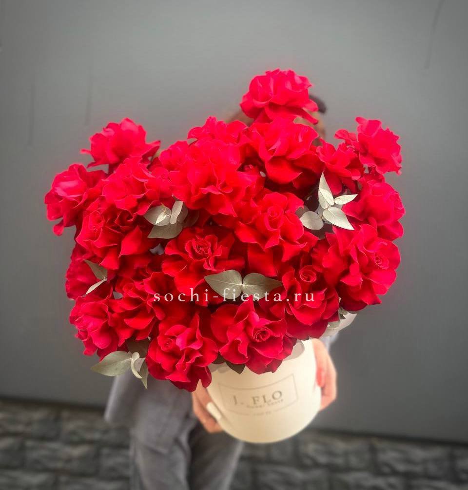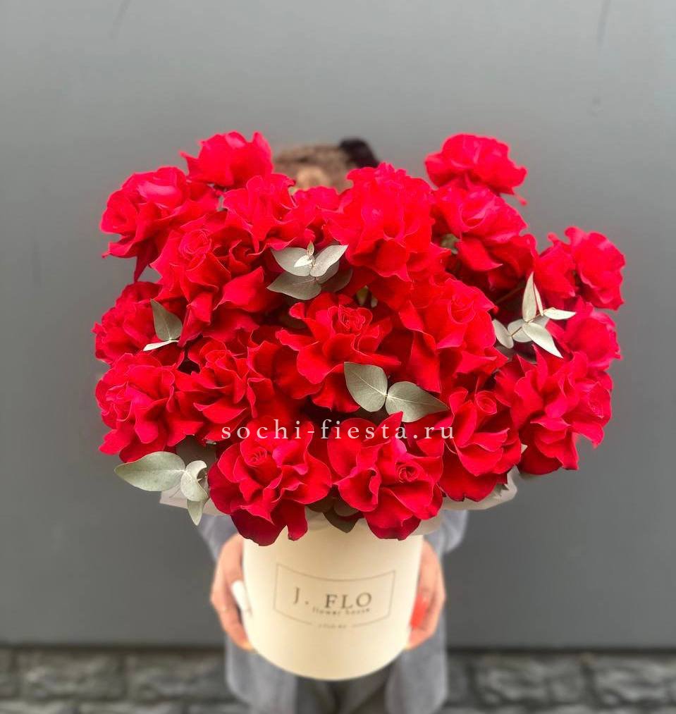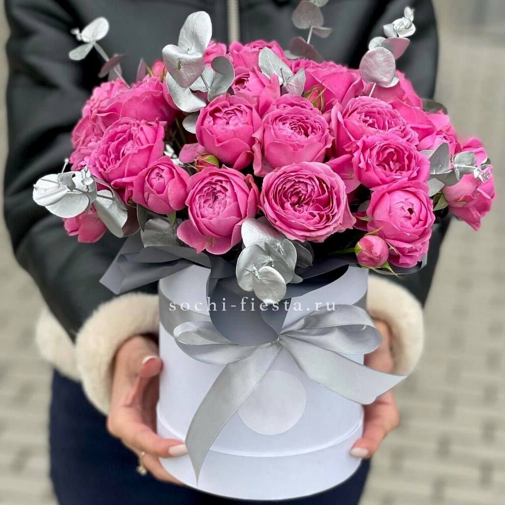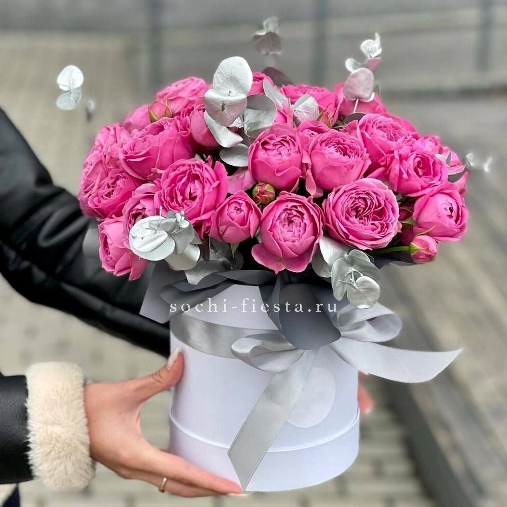 Пионовидная роза Бомбастик образует плотные бутоны с множеством лепестков. Эвкалипт добавляет свежести и завершает форму. Компактная коробка удобна для передачи из рук в руки.