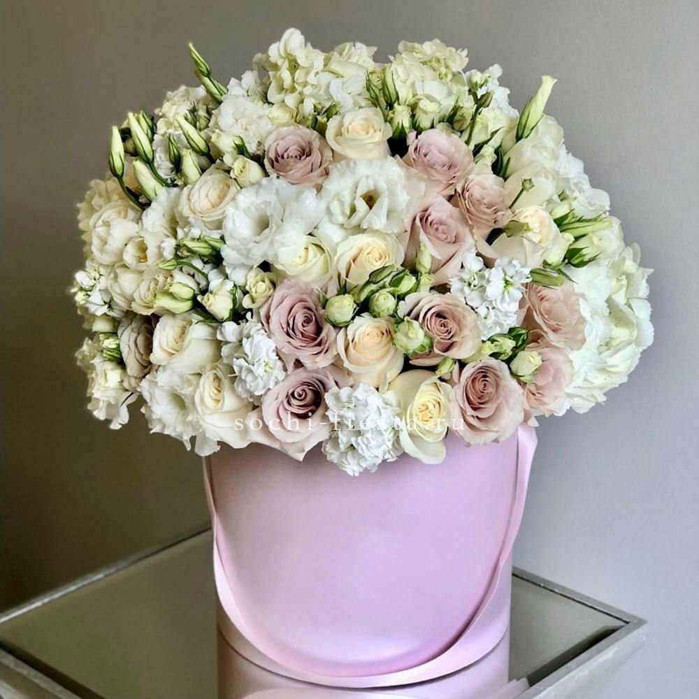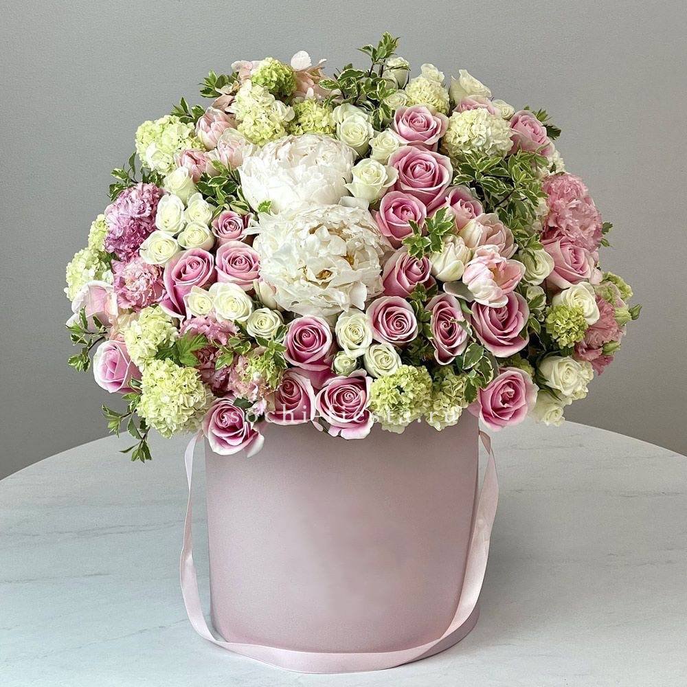 Пионовидные бутоны и шапки гортензии заполняют бокс густой textured массой. Композиция держит форму и создаёт ощущение цветочной волны в ограниченном пространстве.
