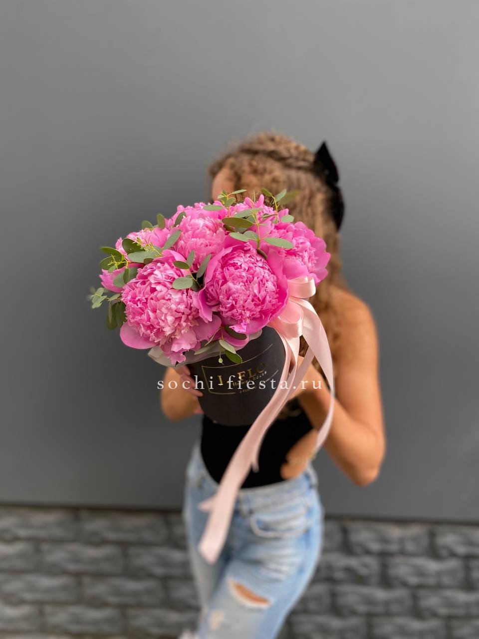 7 пионов, эвкалипт, лента, цилиндр D13.