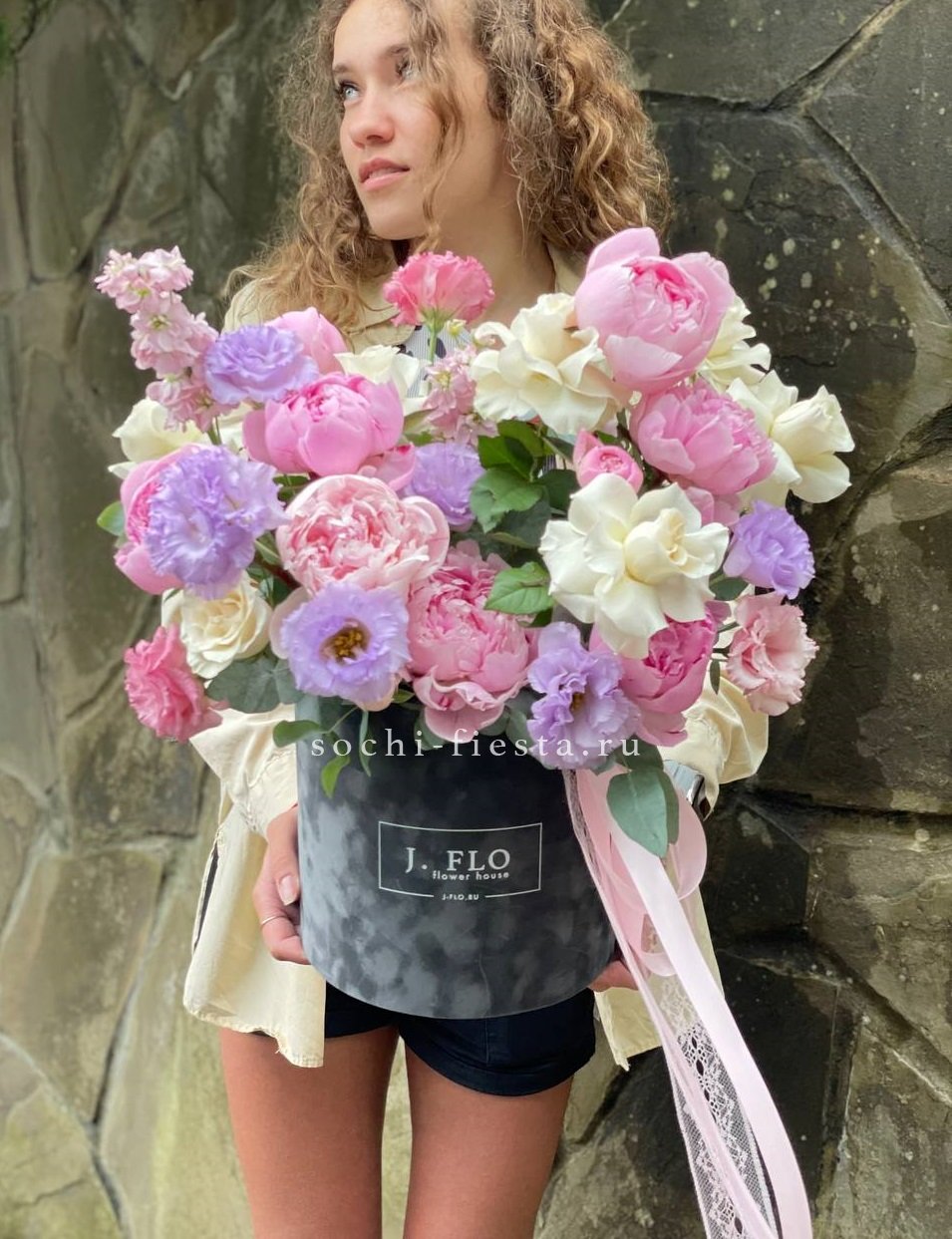 пионы, одноголовые розы, эустома, маттиола (аналог вне сезона), эвкалипт, лента, цилиндр D20.