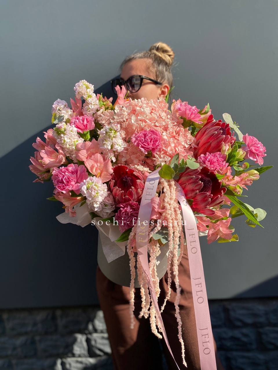 Протеи привносят графичность и экзотичный силуэт. Матиолла и альстромерии смягчают линии, а диантусы расставляют акценты по всей композиции.