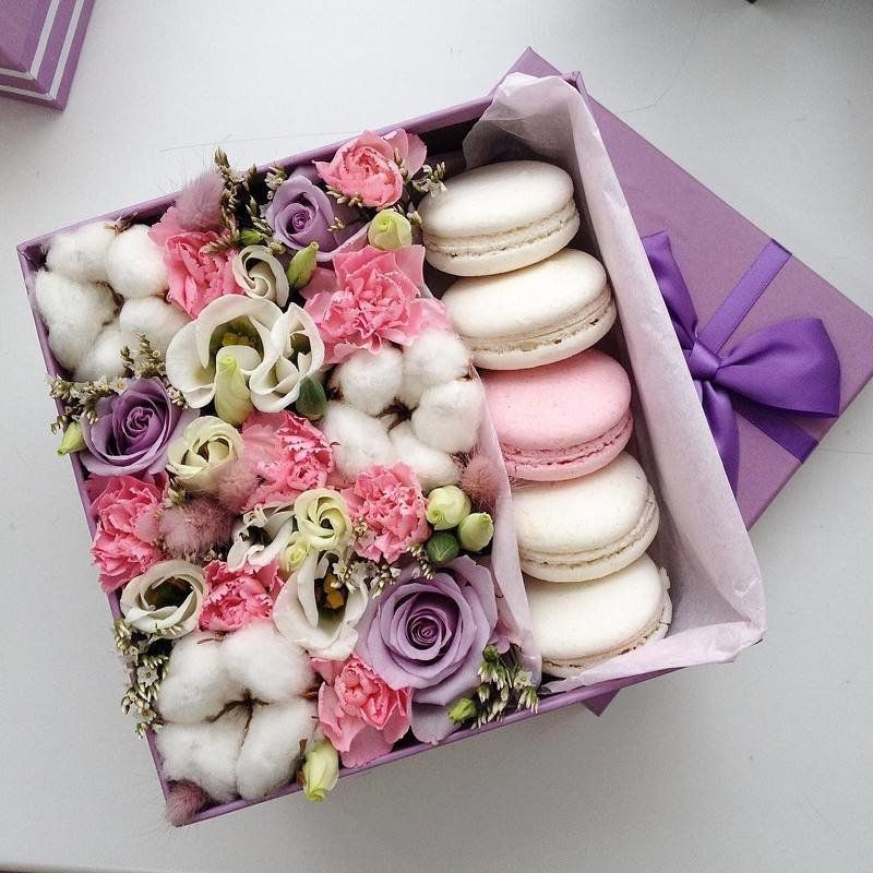 композиция из различных видов цветов, 5 макаронс, цилиндр D16 Цвет коробки может незначительно отличаться от предложенного на фотографии. Крышка не поставляется к готовому варианту изделия.