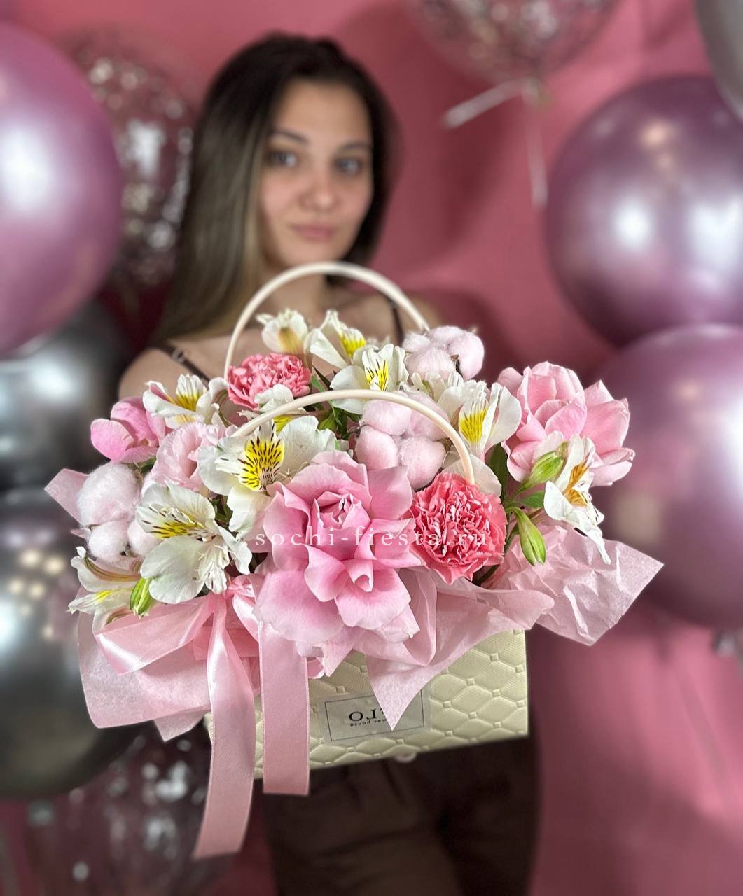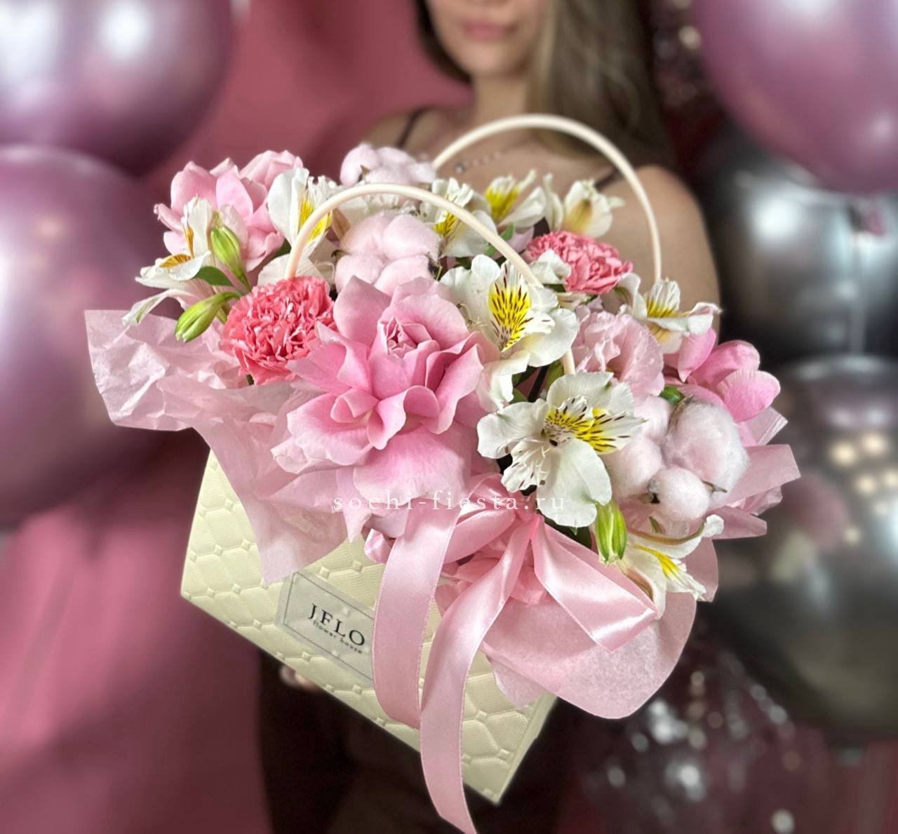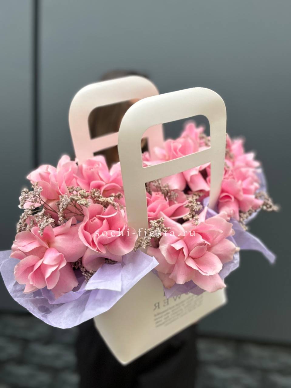 гортензия, розовые розы, эустома, диантусы,эвкалипт, лента, сумка-кашпо.