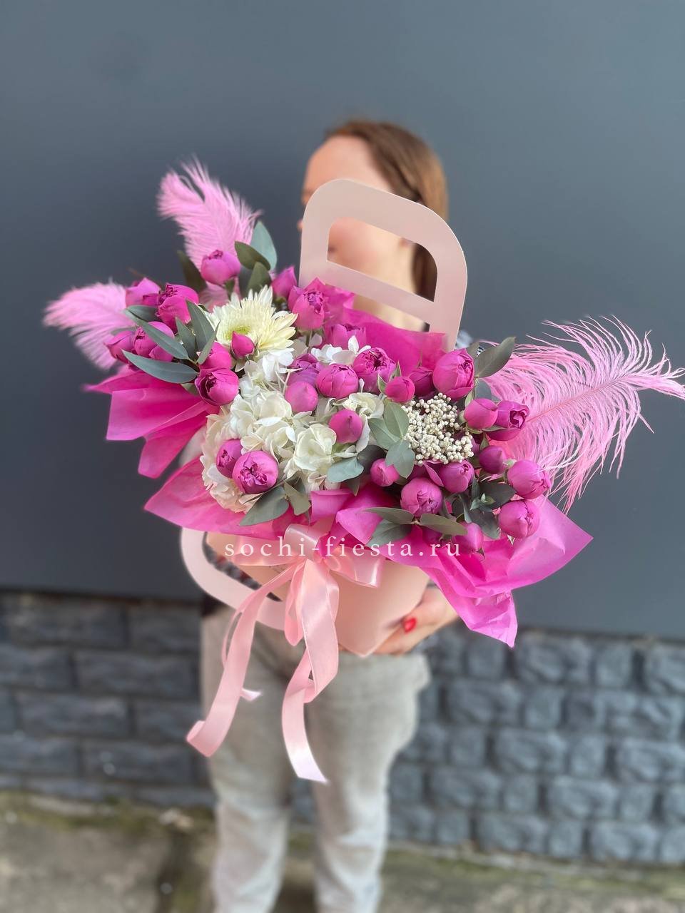 хризантема, маттиола, гербера, бомбастик, эустома, сумочка.