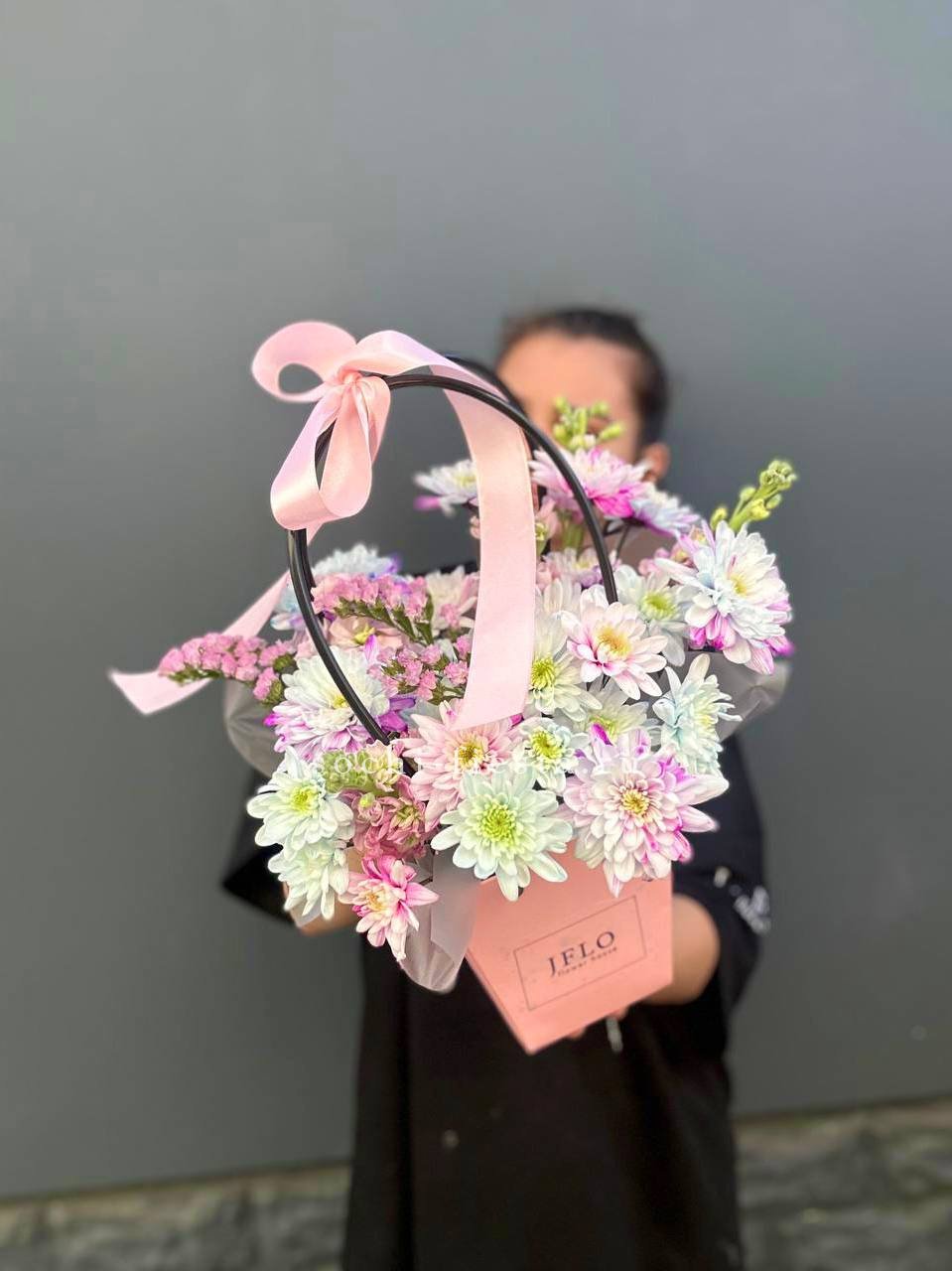 Голубая гортензия задаёт тон всей композиции, где хризантема и эустома создают объём, а хлопок с лагурусом добавляют воздушности. Сумочка вмещает насыщенную палитру без перегруженности.