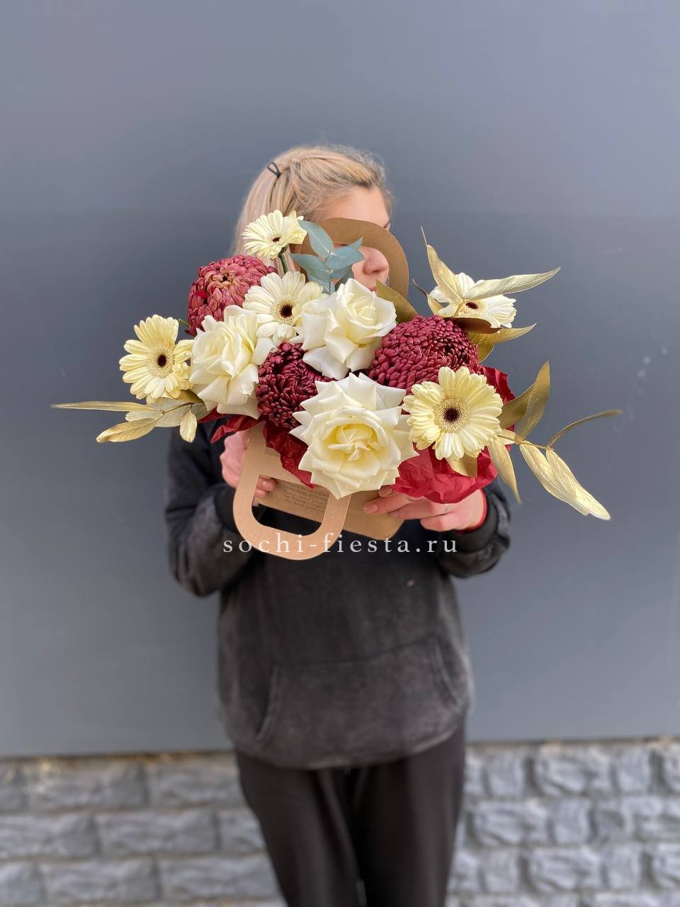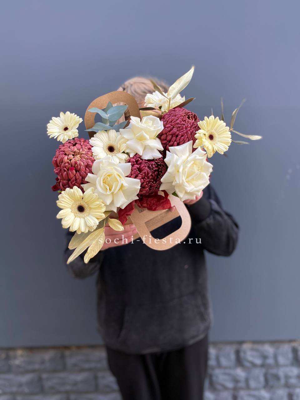 Яркая композиция в формате сумочки объединяет насыщенные герберы и белые розы. Бигуди добавляют графичности, эвкалипт завершает форму мягкими линиями.