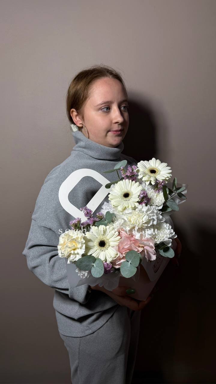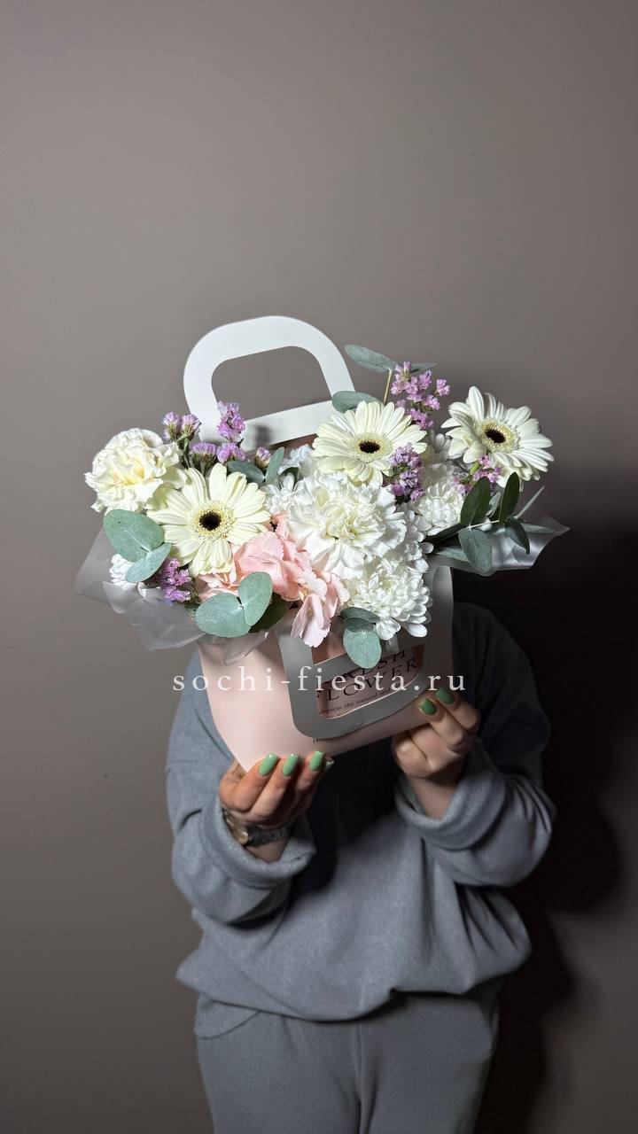 Миниатюрная композиция в удобной сумочке сочетает пышные головки хризантем с бархатистыми розами и воздушным диантусом. Веточки эвкалипта добавляют свежести, а компактная форма позволяет разместить цветы на рабочем столе или прикроватной тумбе.