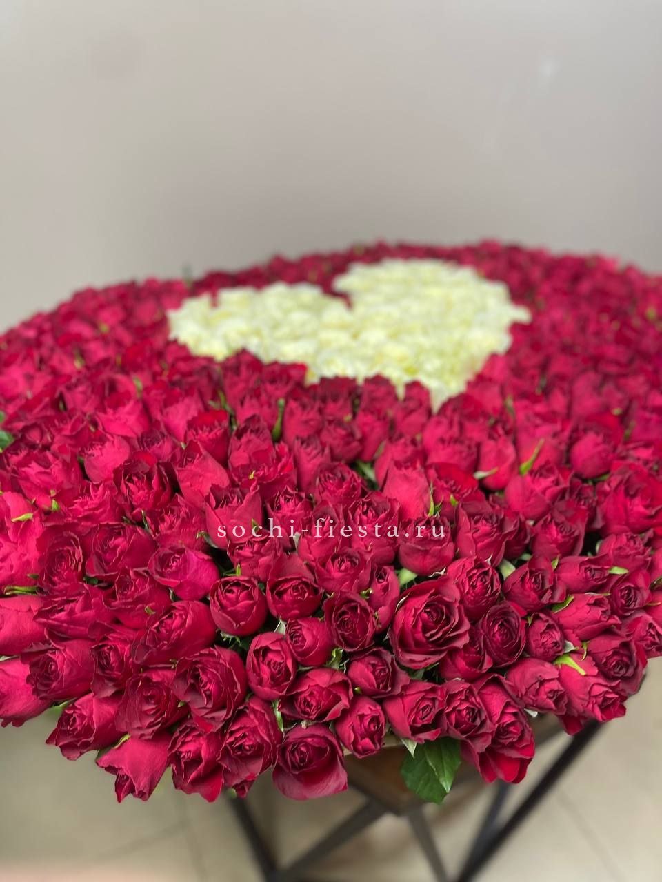 Пятьсот один бутон создает монументальную композицию в естественной корзине. Плотное заполнение формирует цельное полотно красного цвета, которое невозможно не заметить с первой секунды.