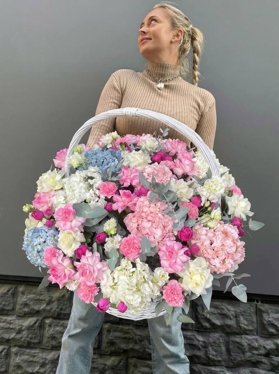 цветочная корзина с розами, мисти баблс, диантусами и гортензией.