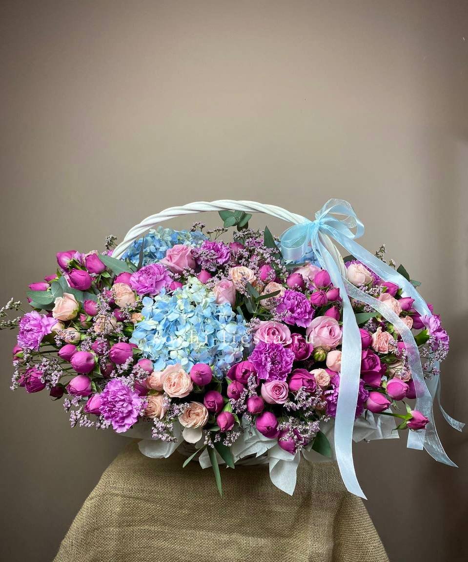 Пышная корзина с розами и гортензией раскрывается мягкими переходами розовых тонов. Эустома и диантус добавляют воздушности, а эвкалипт создает свежую основу для многослойной композиции. Авторская работа для важных событий и значимых встреч.