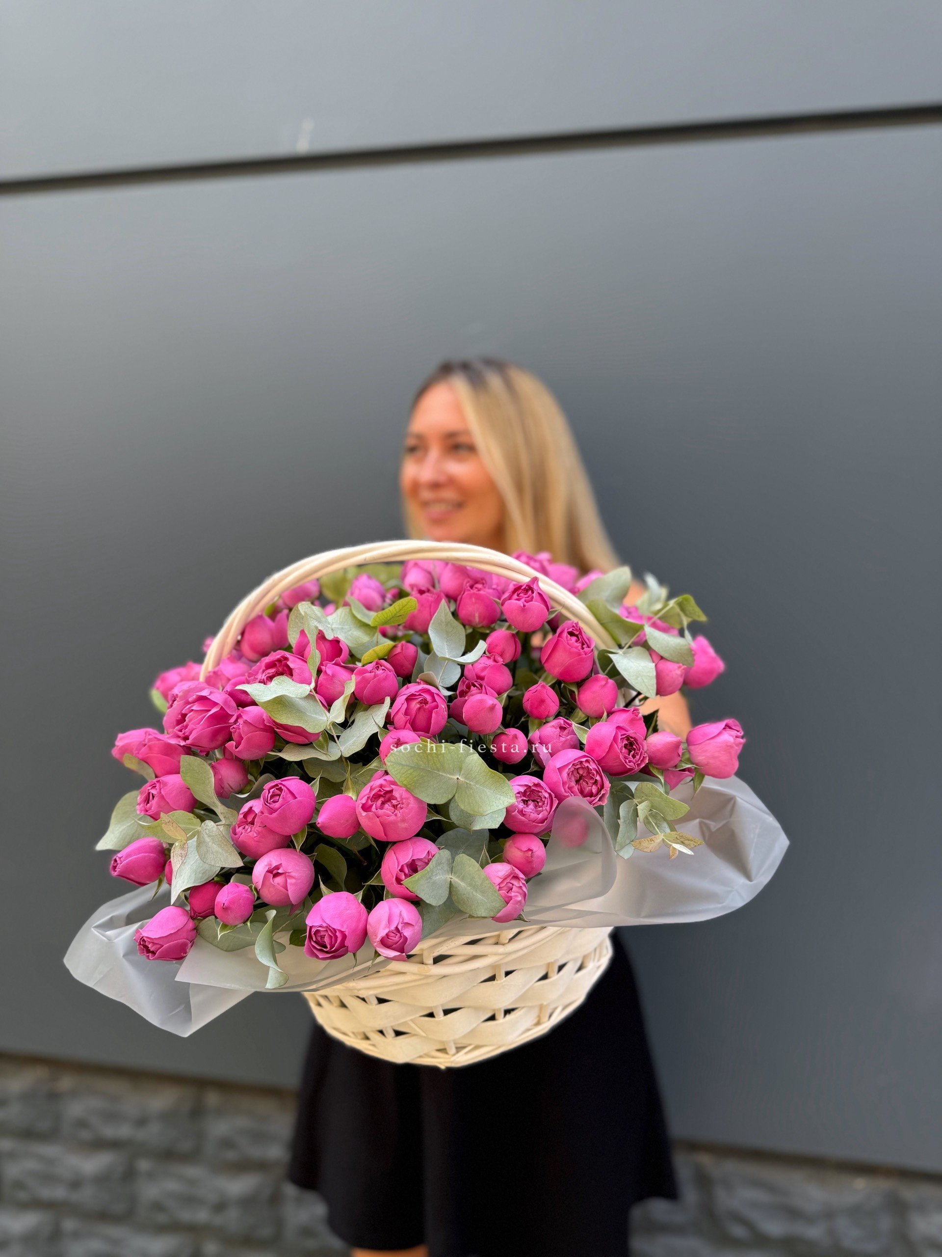 роза одноголовая, роза пионовидная, альстромерия, эустома, гортензия, ковыль, диантус, плетеная корзина.