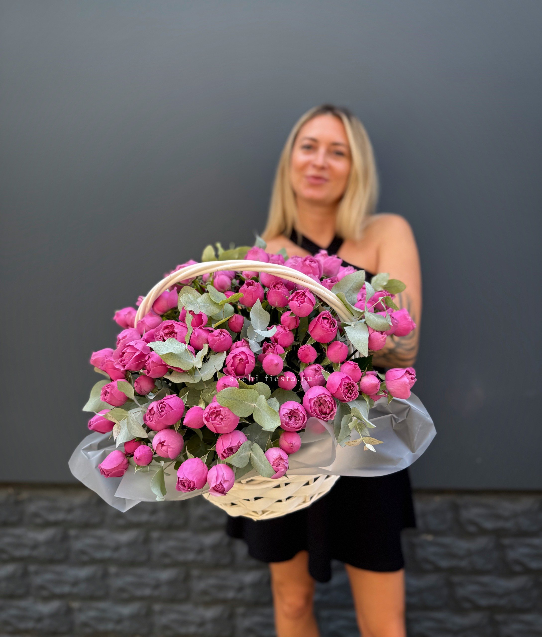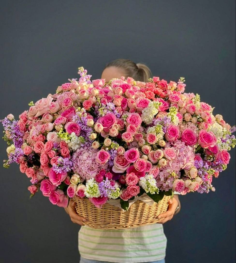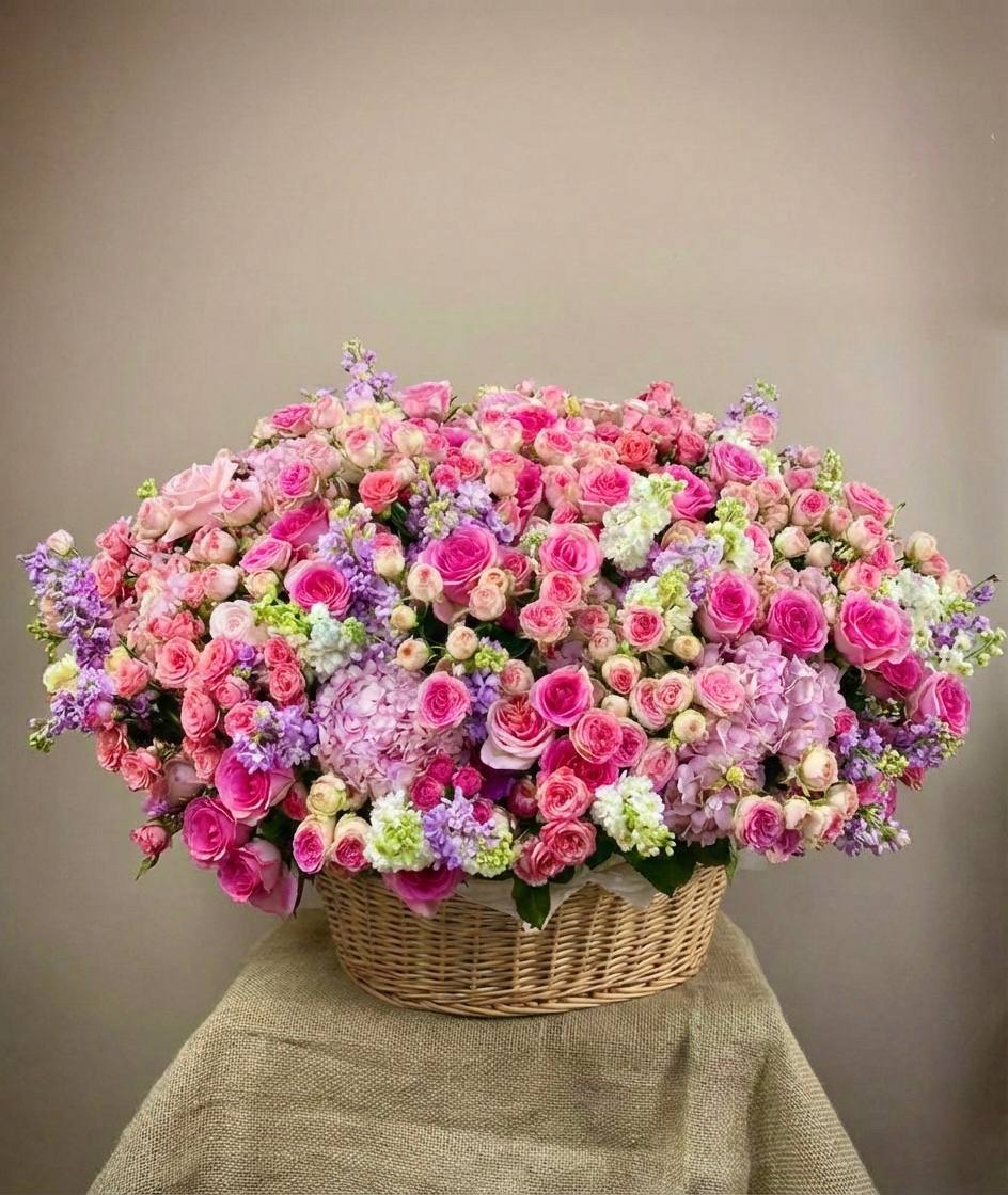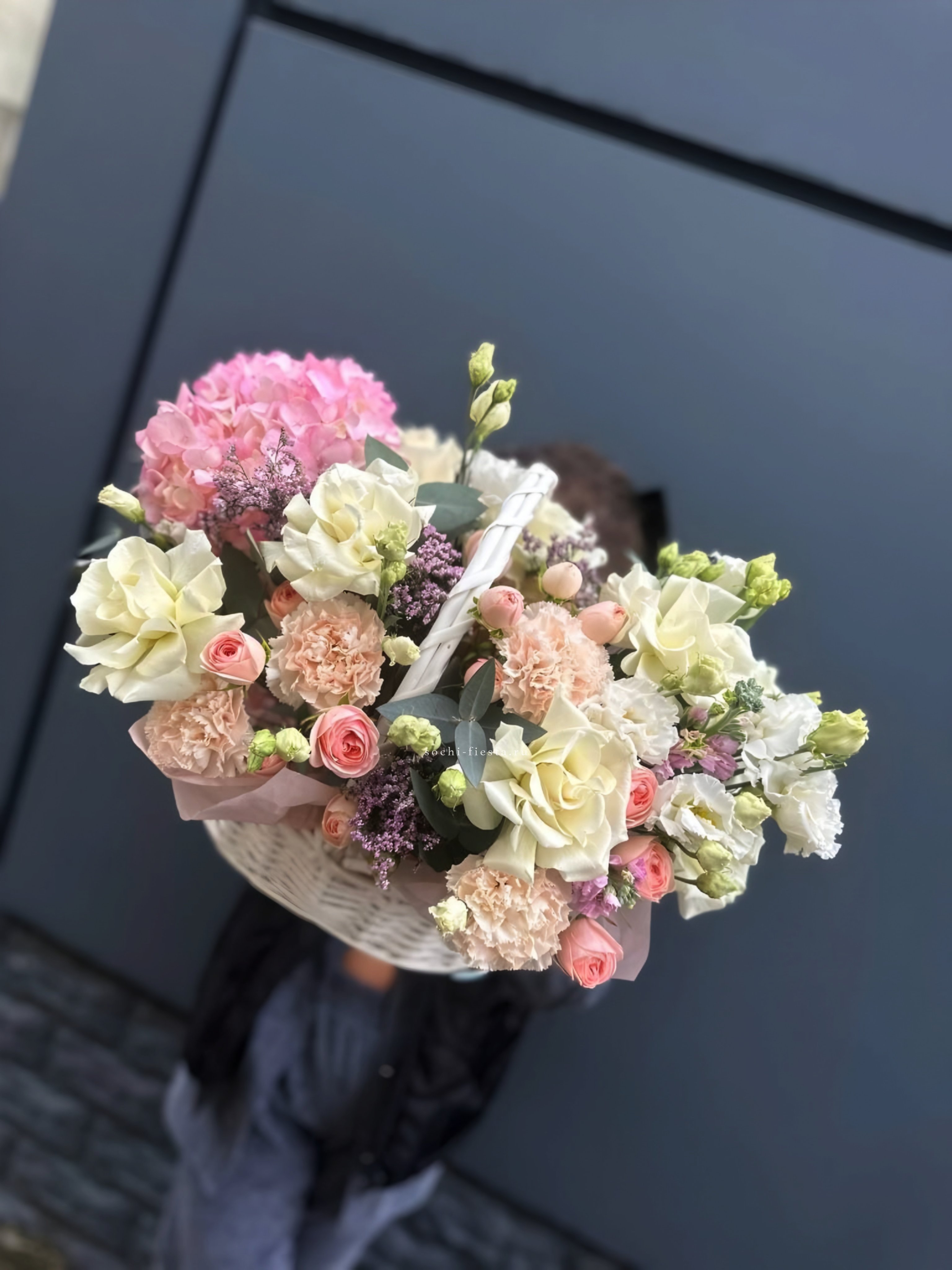Корзина объединяет садовые розы с воздушной эустомой и яркими вспышками альстромерии. Ковыль добавляет лёгкости, а гортензия создаёт фактурный фон для всей композиции.