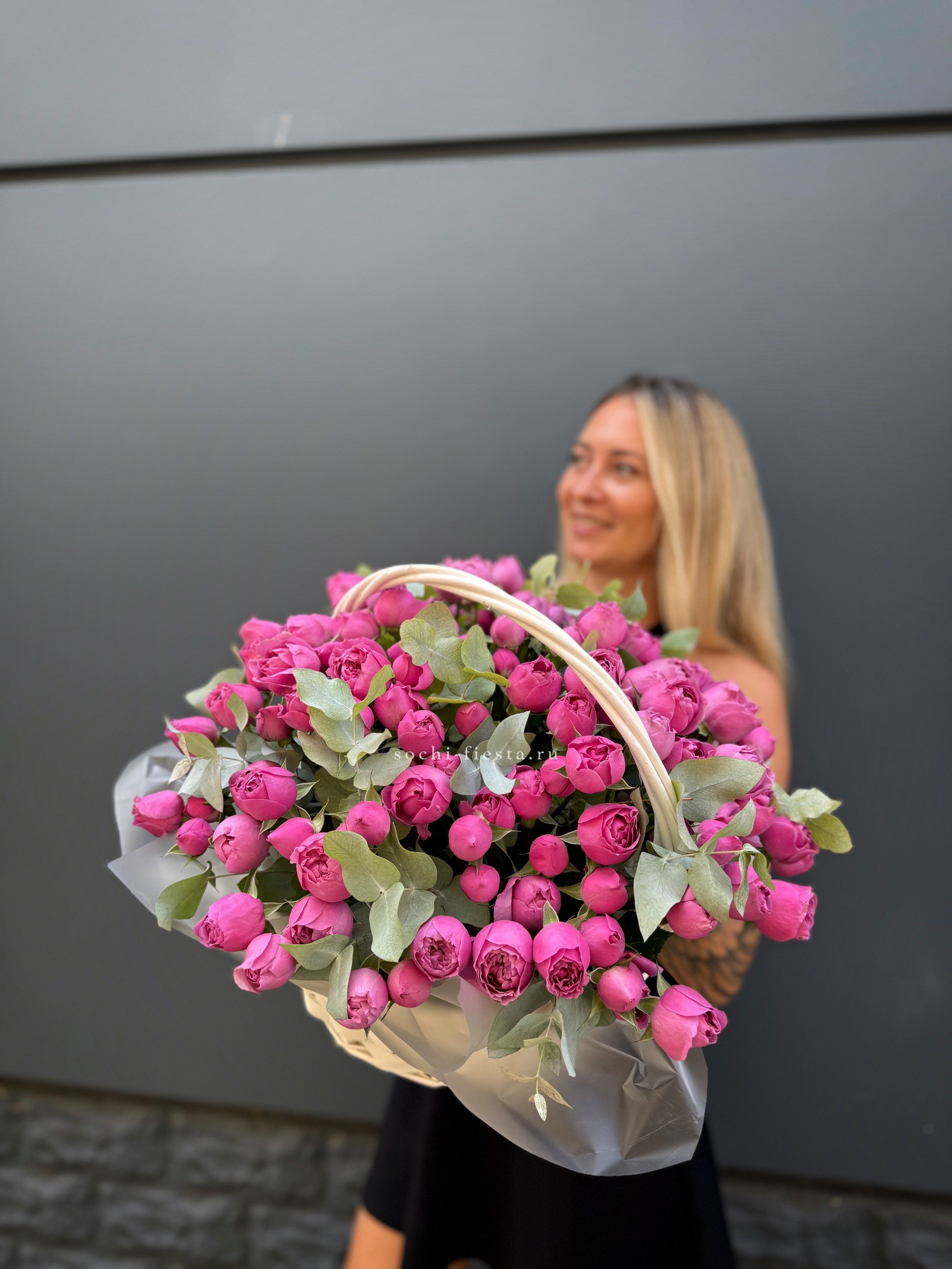 Сорок одна пионовидная роза в светлой корзине выстраивает объёмную композицию с мягкими переливами лилового и розового. Эвкалипт обрамляет густую россыпь бутонов.
