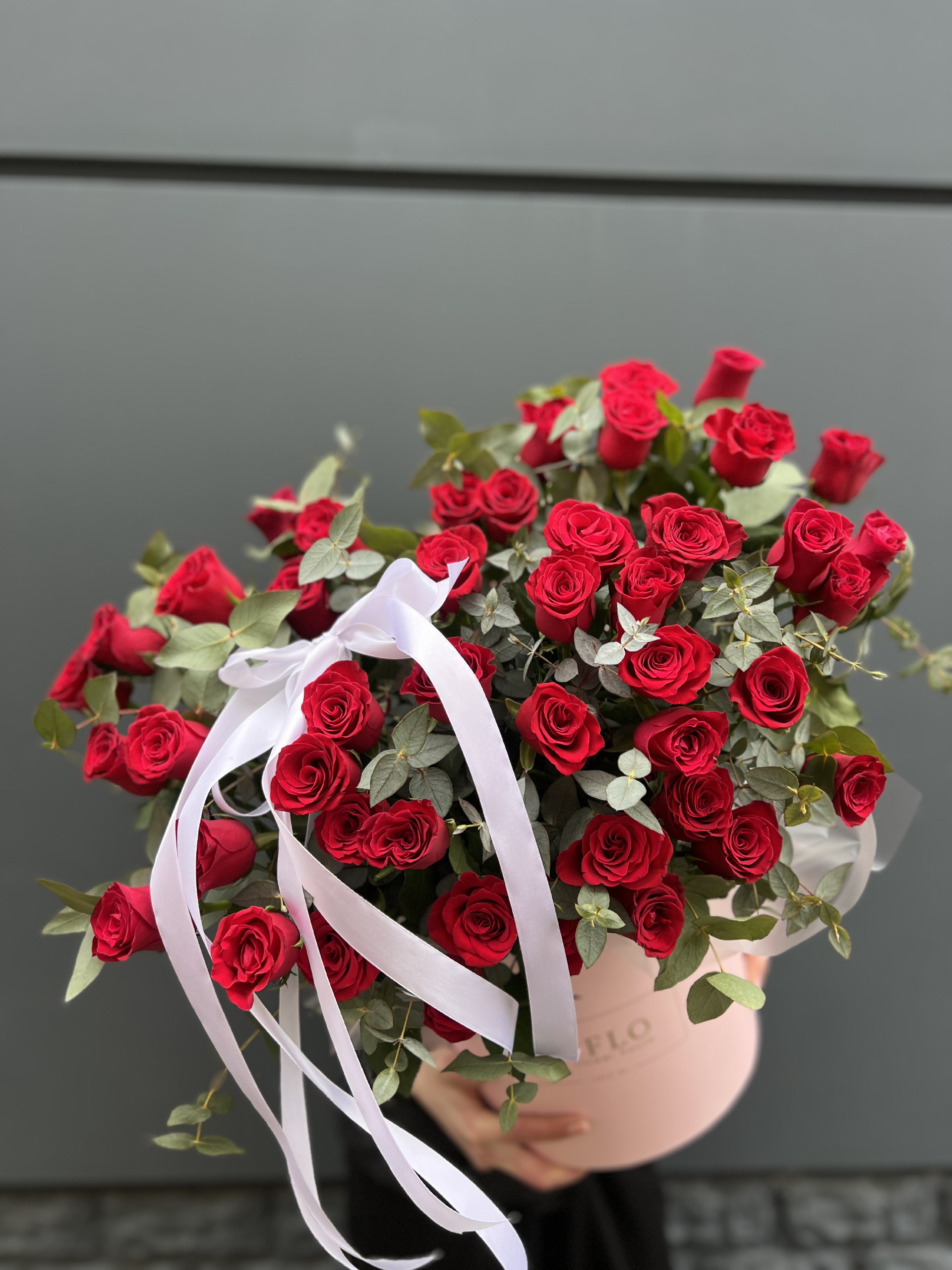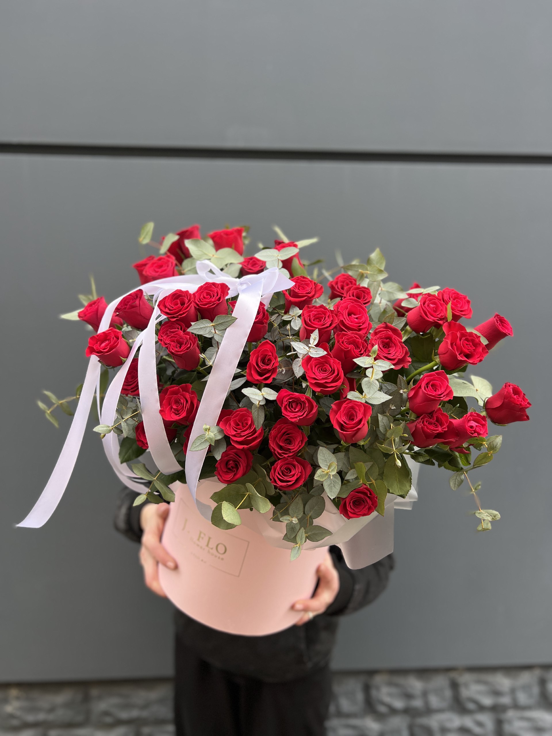 розы, кустовые розы, гортензия, маттиола (или аналог вне сезона), эустома, эвкалипт, лента, дизайнерская упаковка.