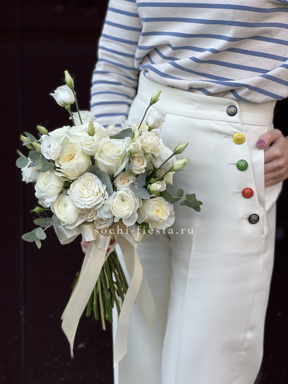 пионовидные розы Бомбастик, одноголовые розы, эвкалипт, лента.