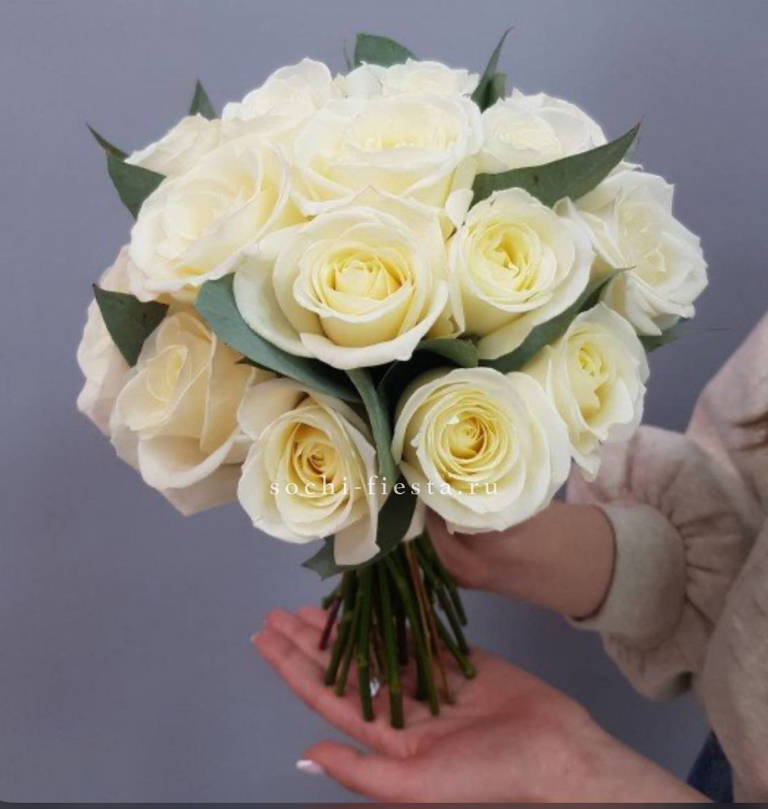 кустовые пионовидные розы Бомбастик, одноголовая пионовидная роза (или замена вне сезона на кустовую пионовидную), диантусы, эвкалипт, лента.
